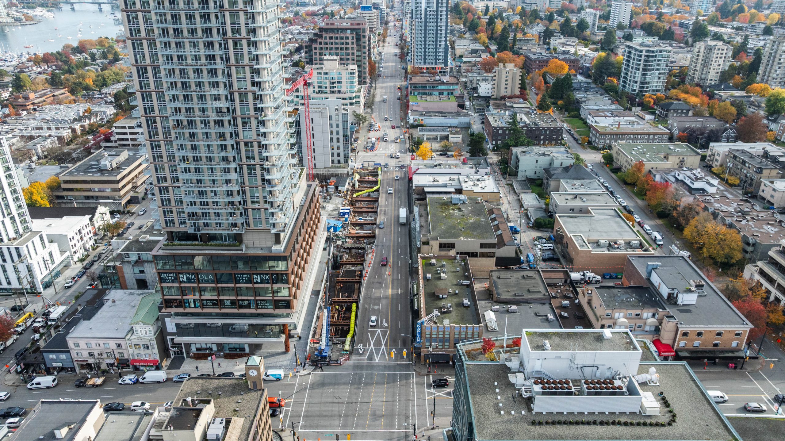South Granville Station is located on the northeast corner of Broadway and Granville Street. The station entrance is integrated with a development built concurrently with station construction.