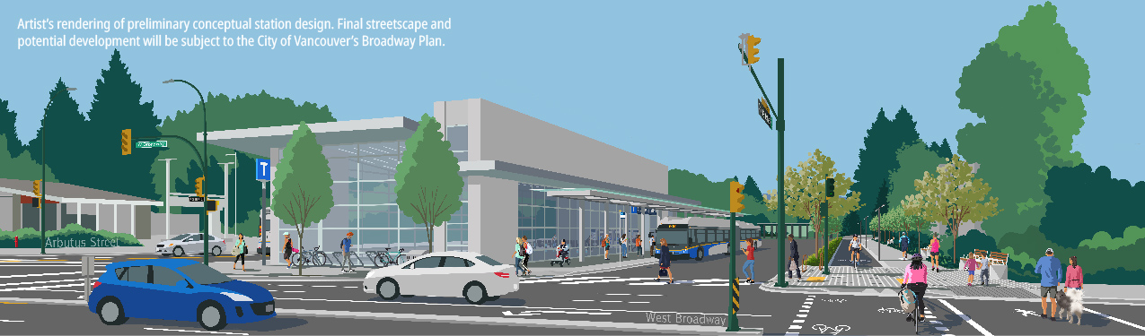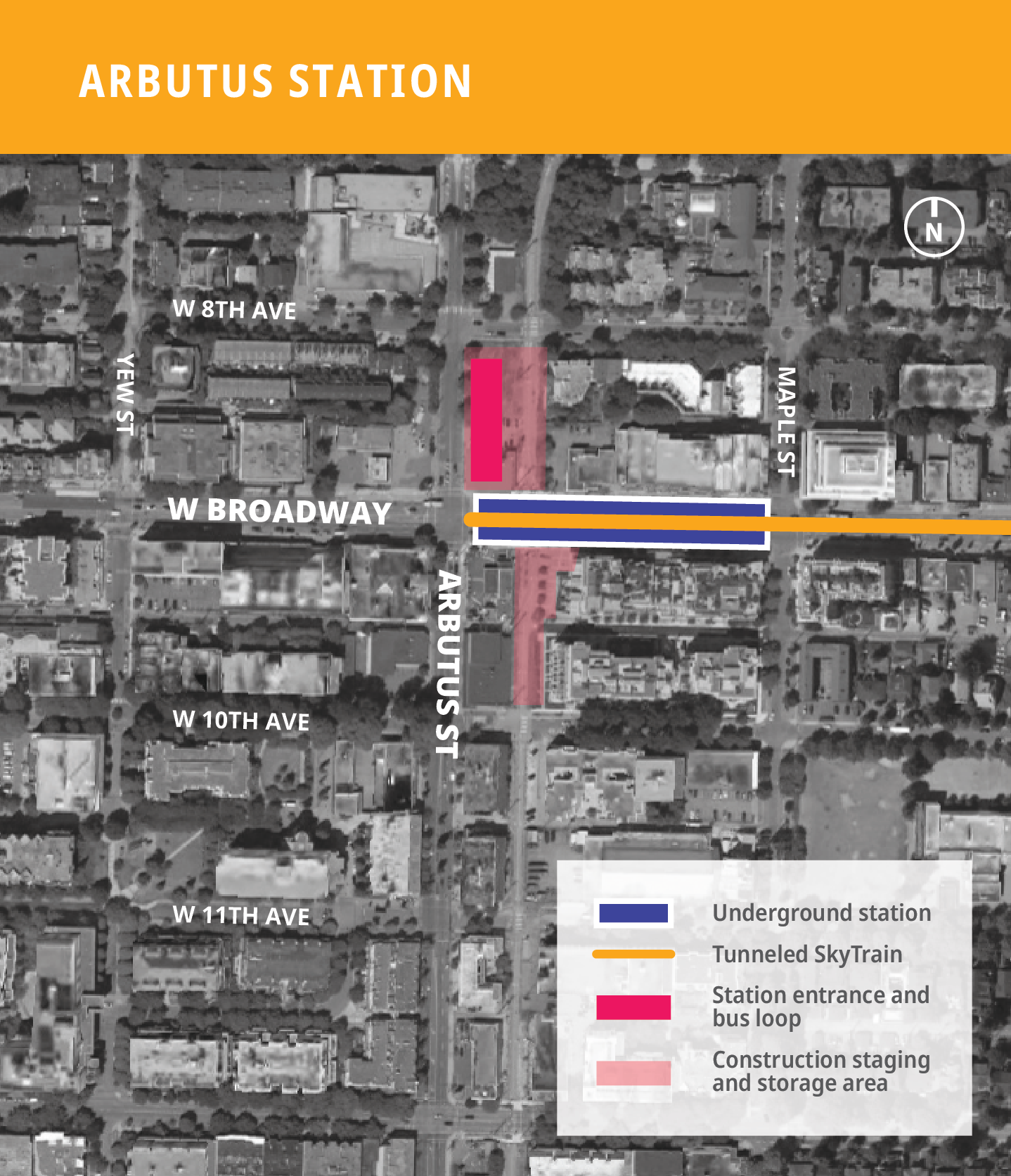 Arbutus Station and bus loop is located at the northeast corner of Broadway and Arbutus Street, adjacent to the Arbutus Greenway. This station and bus loop will connect passengers with B-Line bus service between Arbutus and UBC.