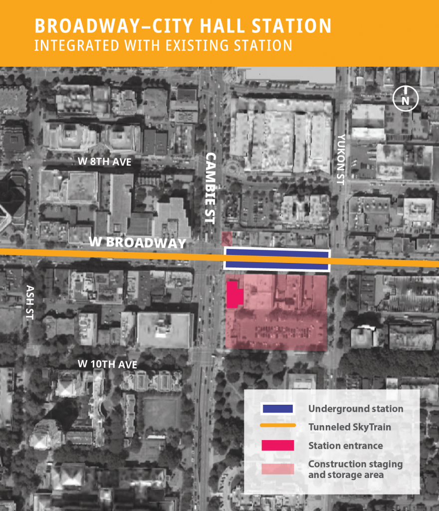 Broadway–City Hall Station will use the existing entrance to the Canada Line at the southeast corner of Broadway and Cambie Street to ensure a convenient underground connection between the Millennium and Canada lines.