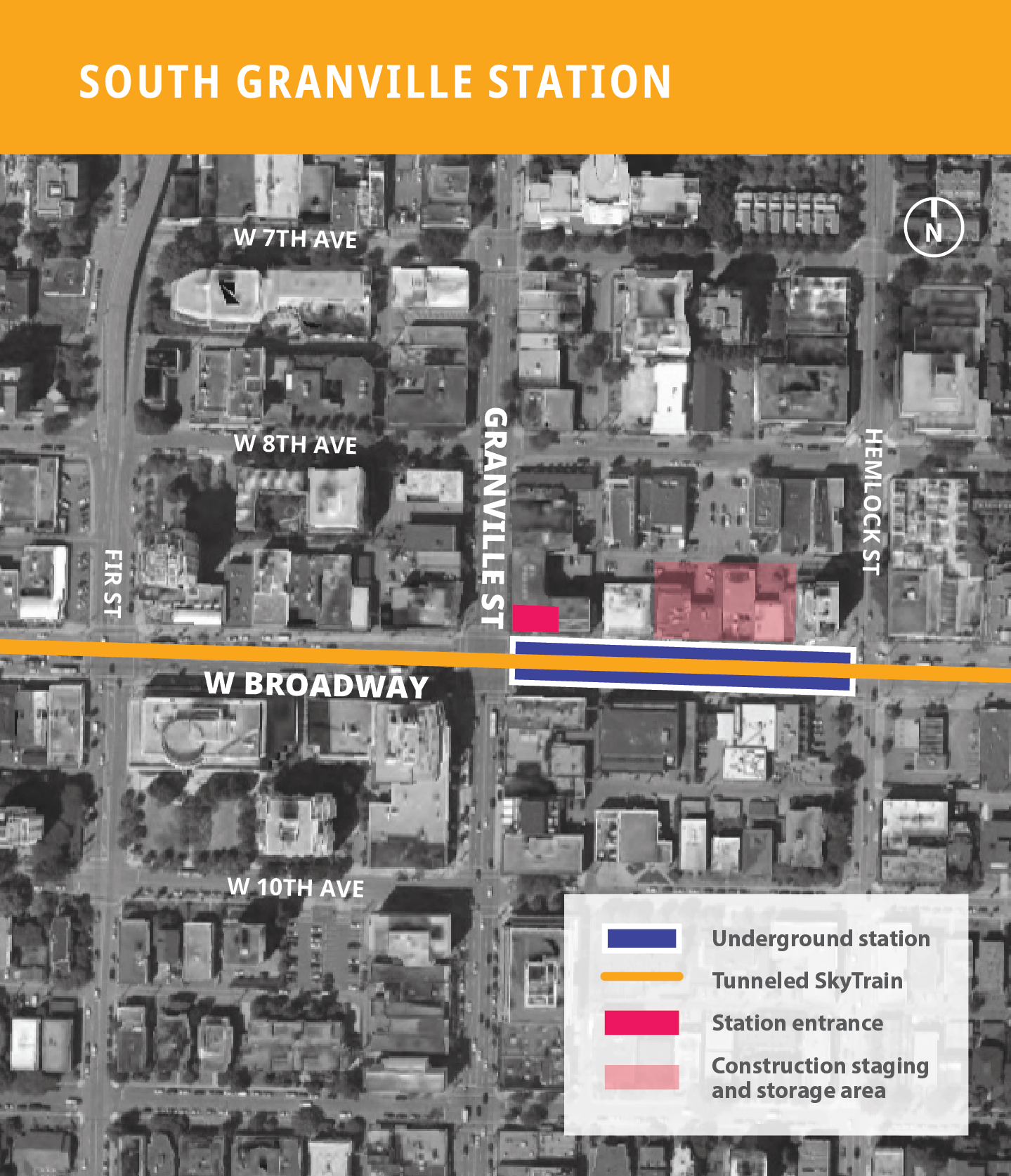 South Granville Station is located on the northeast corner of Broadway and Granville Street. The station entrance is integrated with a development built concurrently with station construction.