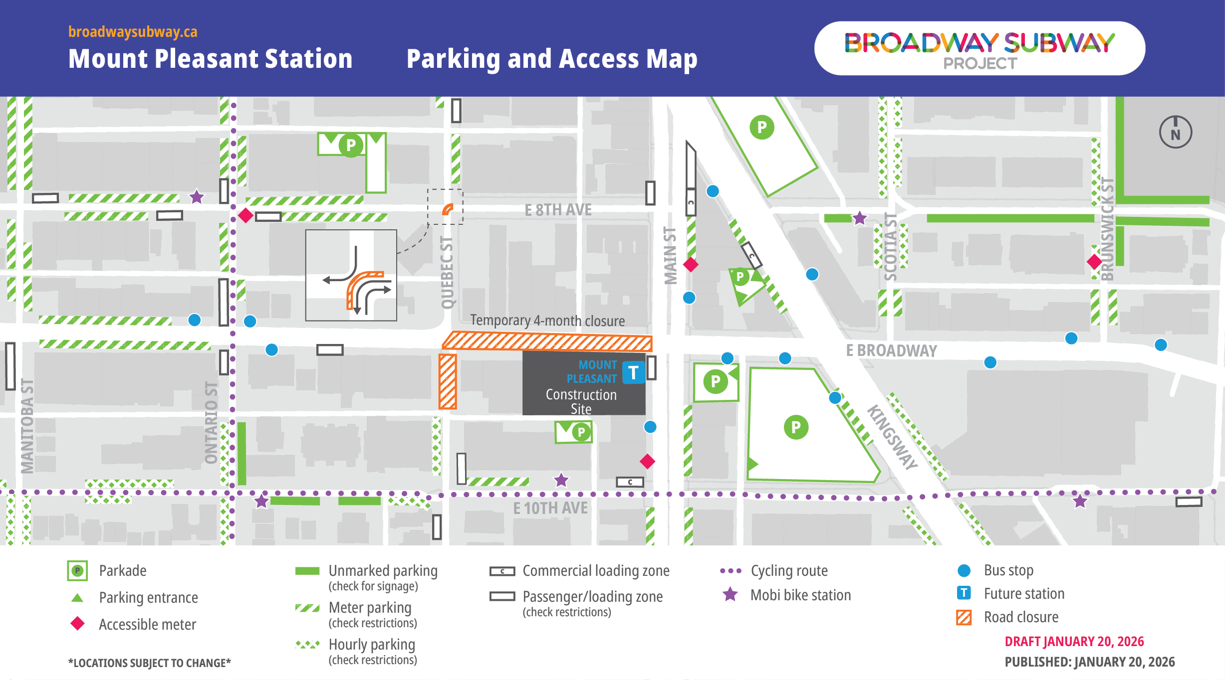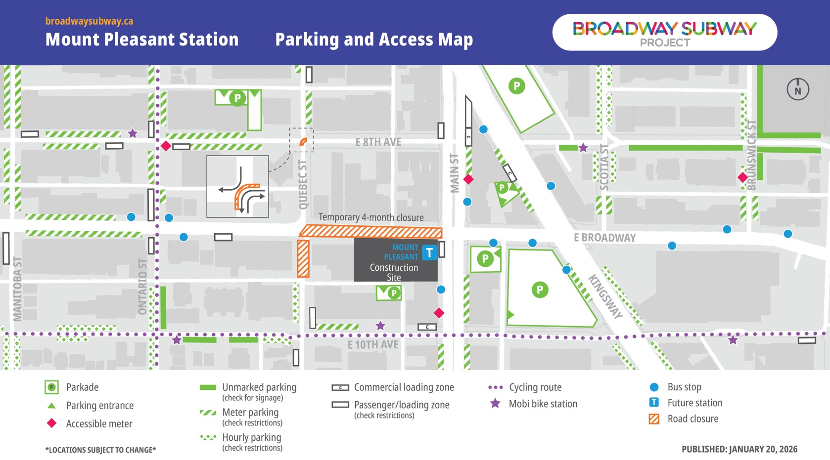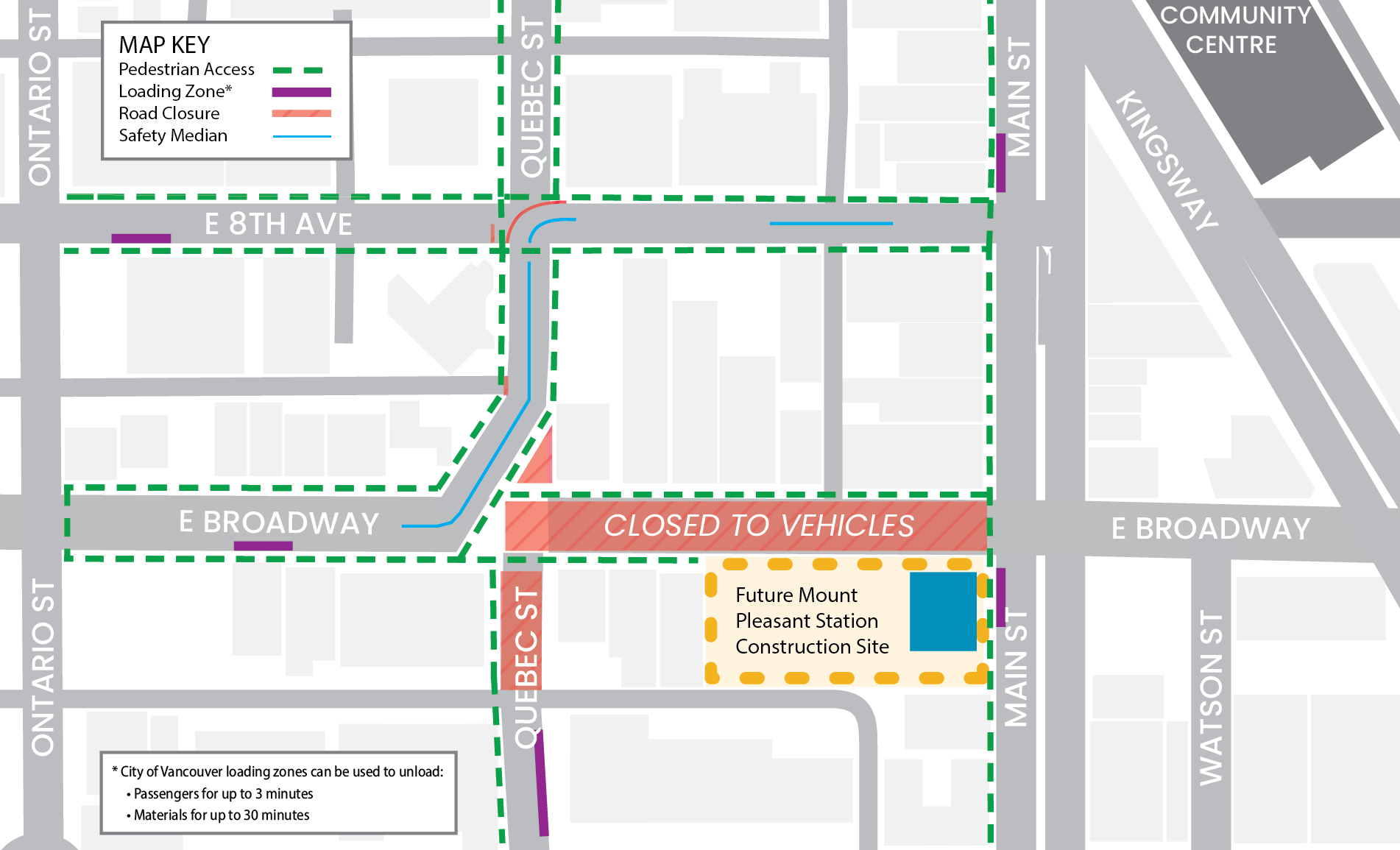 These preparations will create a temporary bus detour around the one-block closure of E. Broadway between Quebec and Main streets, helping to keep people and vehicles moving safely and efficiently during construction.
