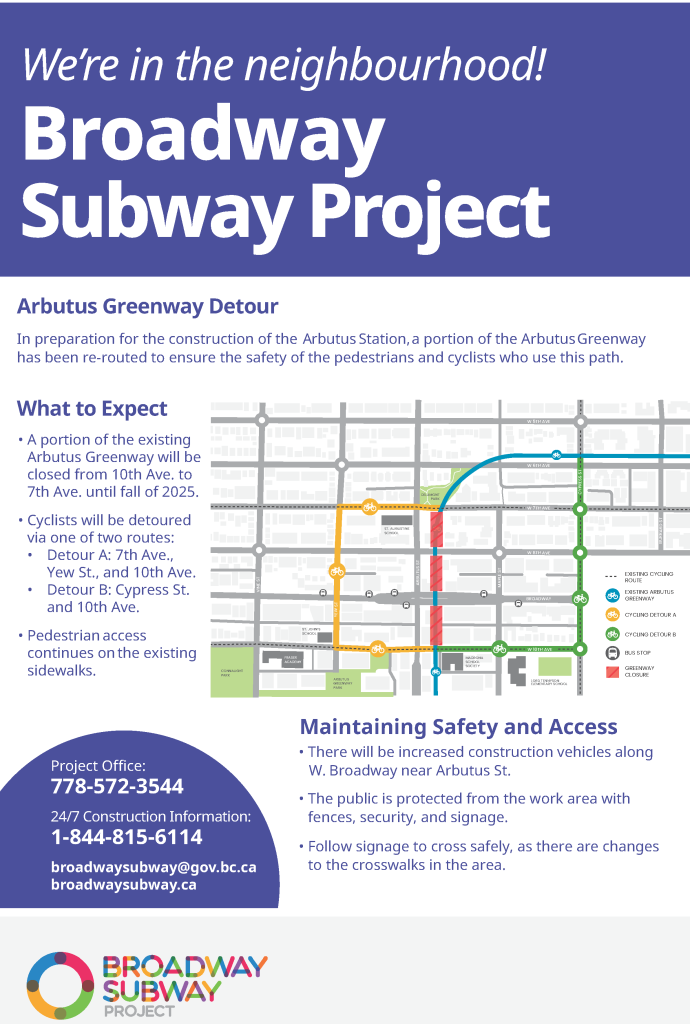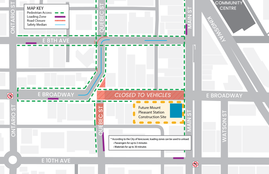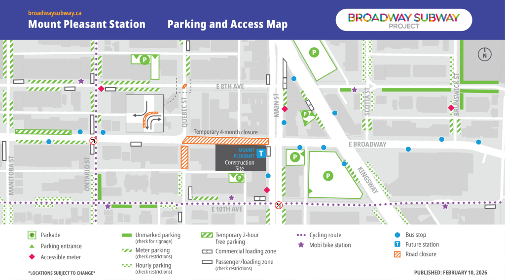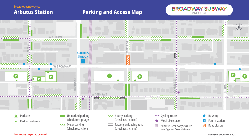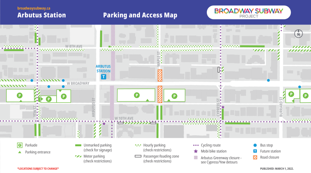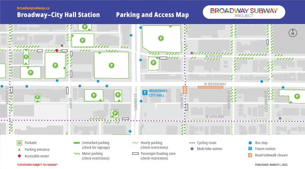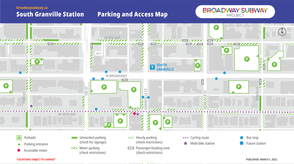 In collaboration with key partners, the Broadway Subway Project has developed alternative parking and access maps for the station areas along the Broadway corridor. Listed locations, including bus stops, are subject to change. Transit users are encouraged to check TransLink’s Trip Planner for updated locations of bus stops.