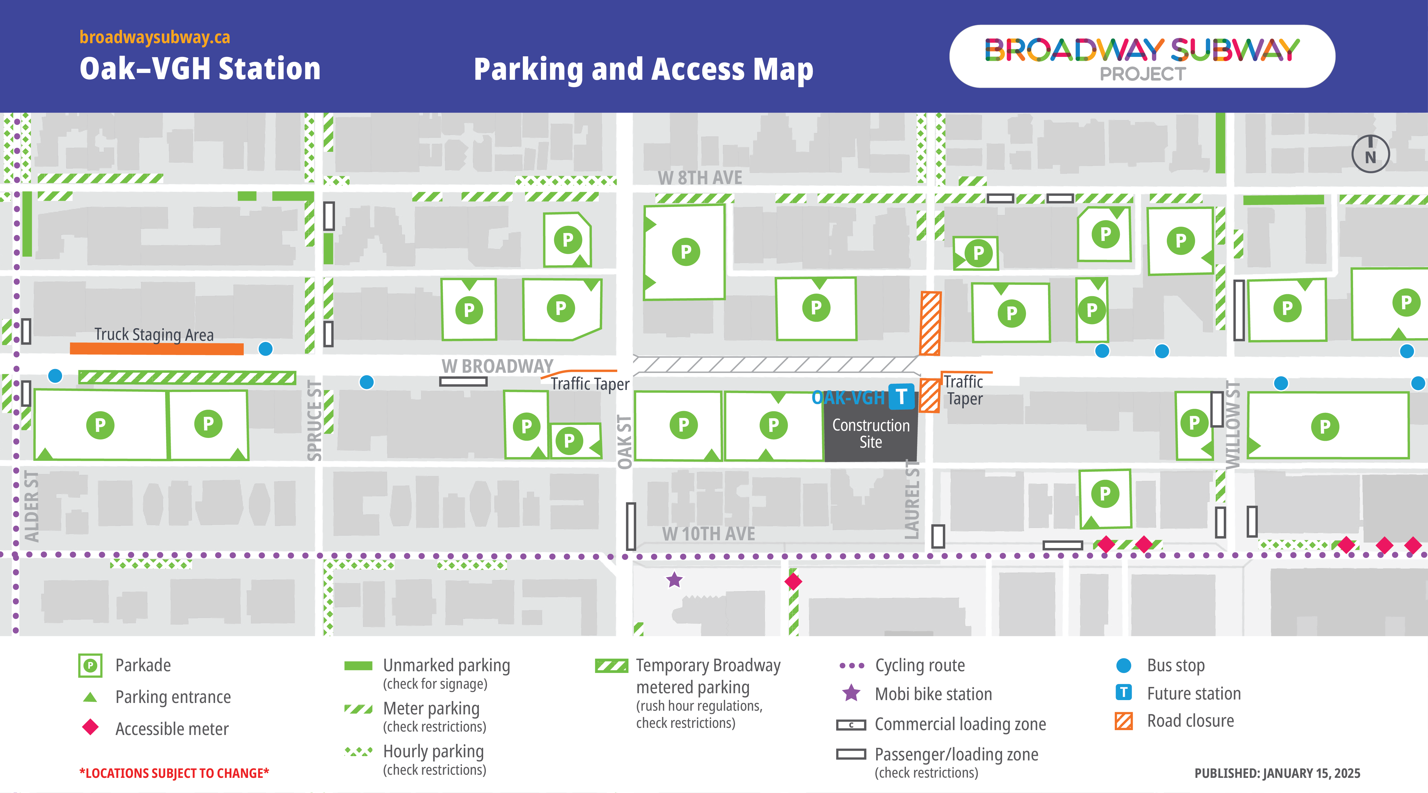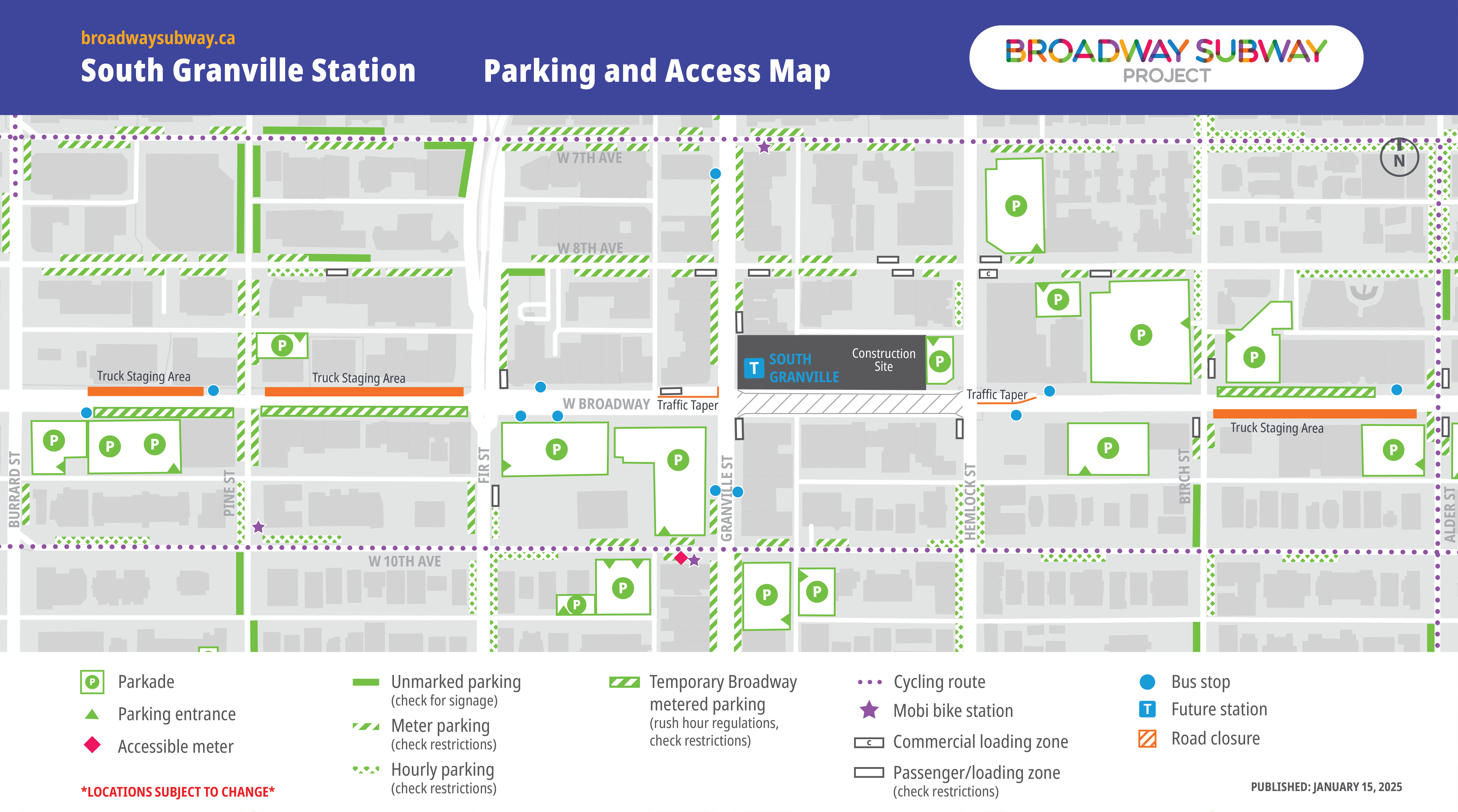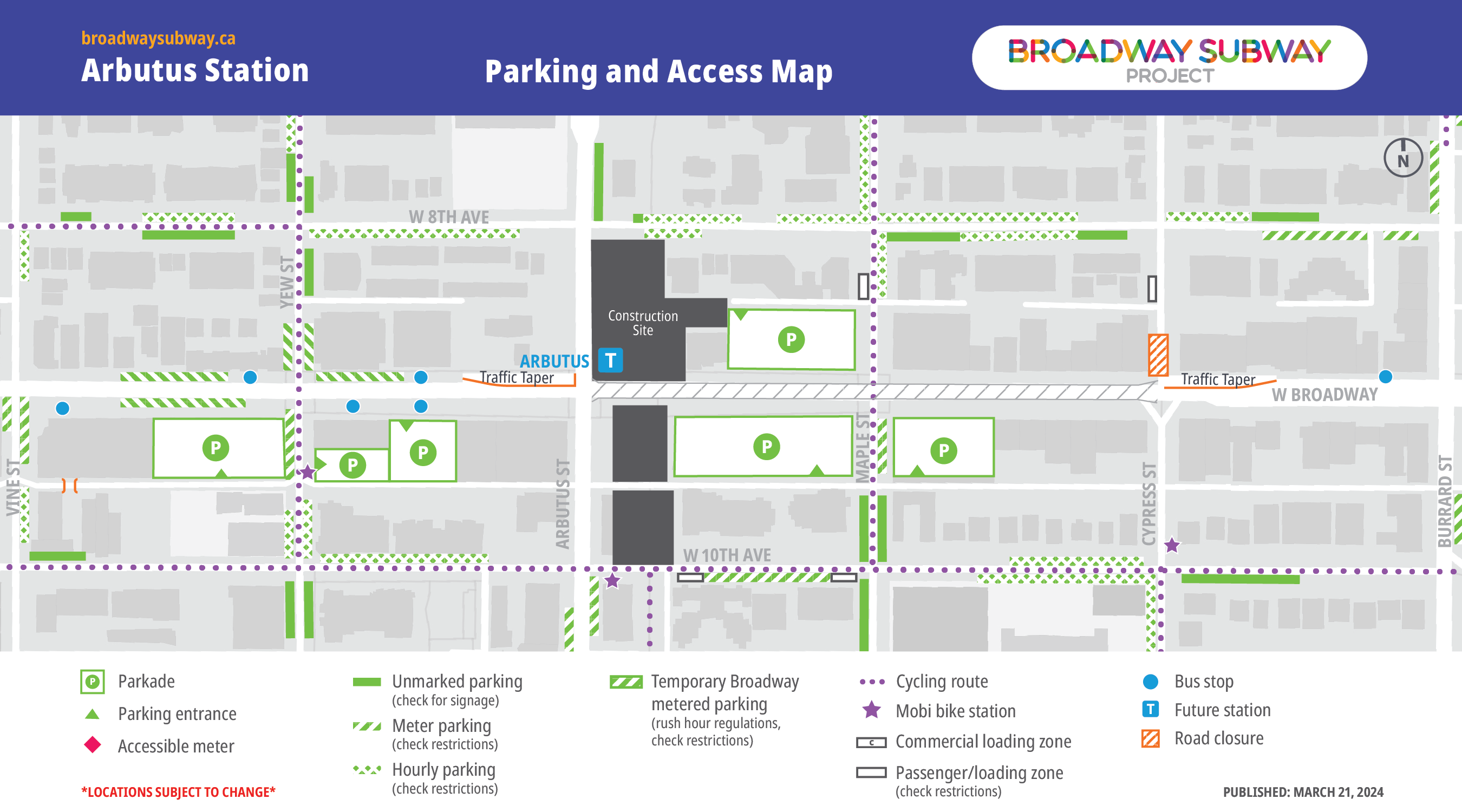 In collaboration with key partners, the Broadway Subway Project has developed alternative parking and access maps for the station areas along the Broadway corridor. Listed locations, including bus stops, are subject to change. Transit users are encouraged to check TransLink’s Trip Planner for updated locations of bus stops.
