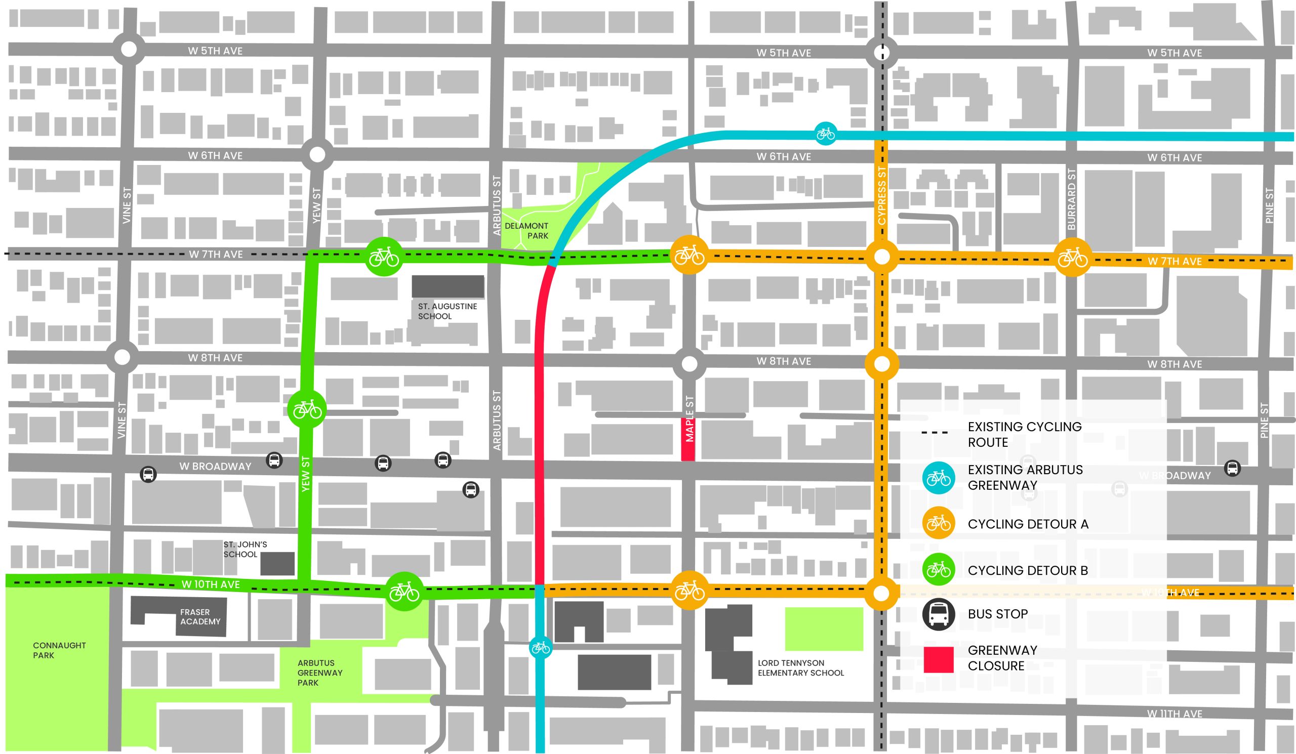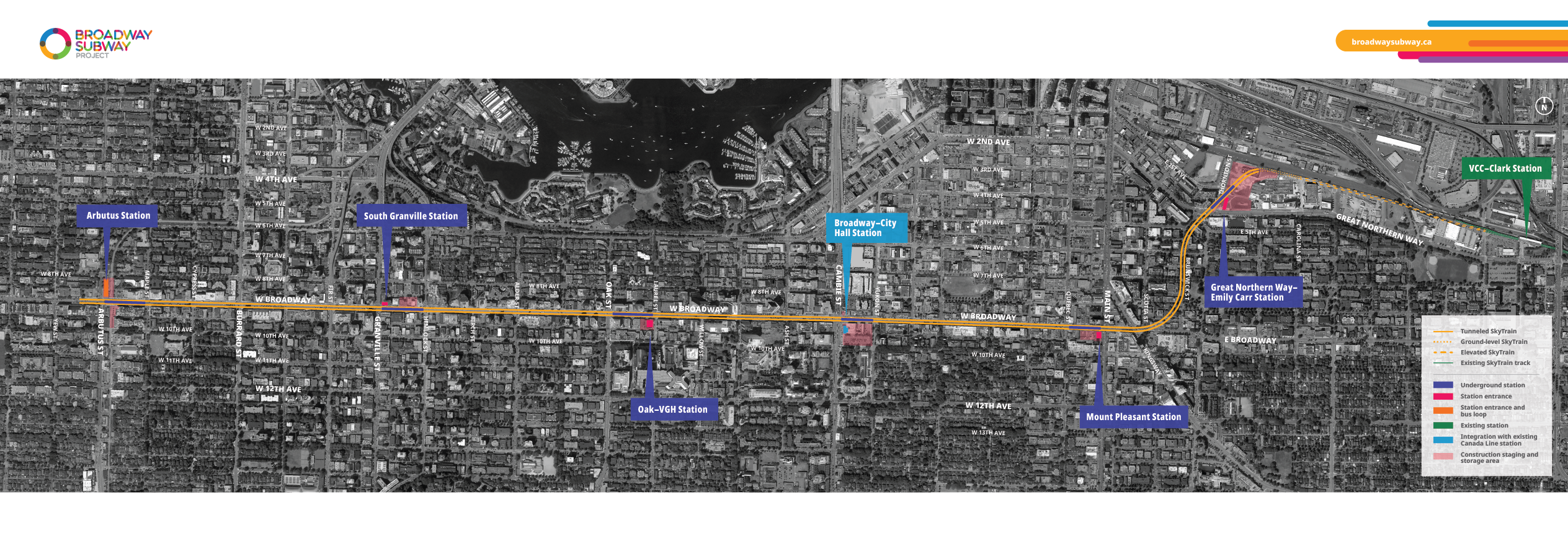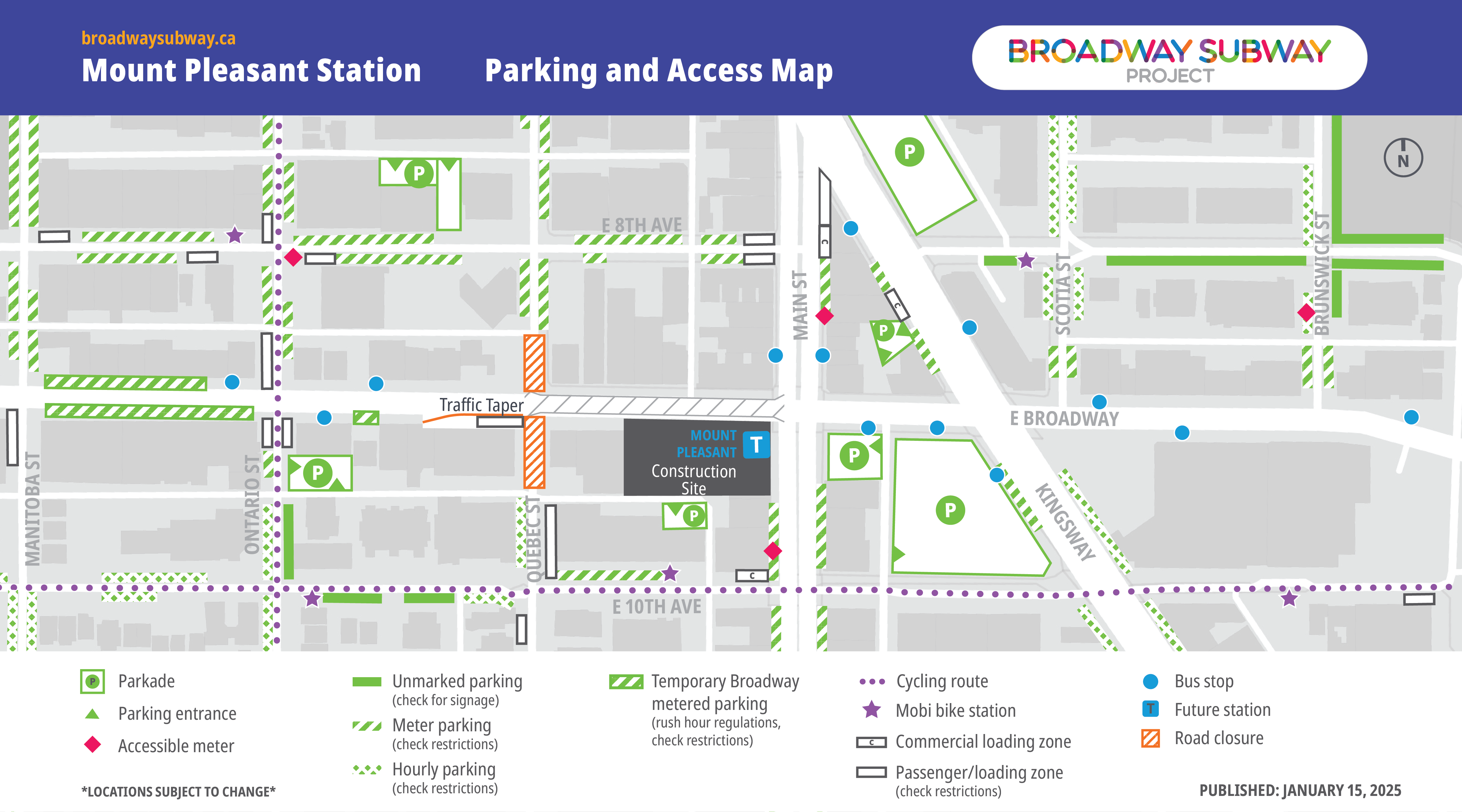 In collaboration with key partners, the Broadway Subway Project has developed alternative parking and access maps for the station areas along the Broadway corridor. Listed locations, including bus stops, are subject to change. Transit users are encouraged to check TransLink’s Trip Planner for updated locations of bus stops.