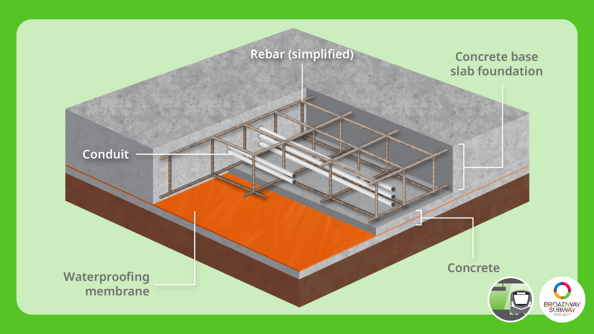 The foundation is made up of layers of concrete with rebar for strength and a waterproof layer to keep the station dry. Pipes are installed in the foundation to connect all the electronic systems that will help operate the SkyTrain.