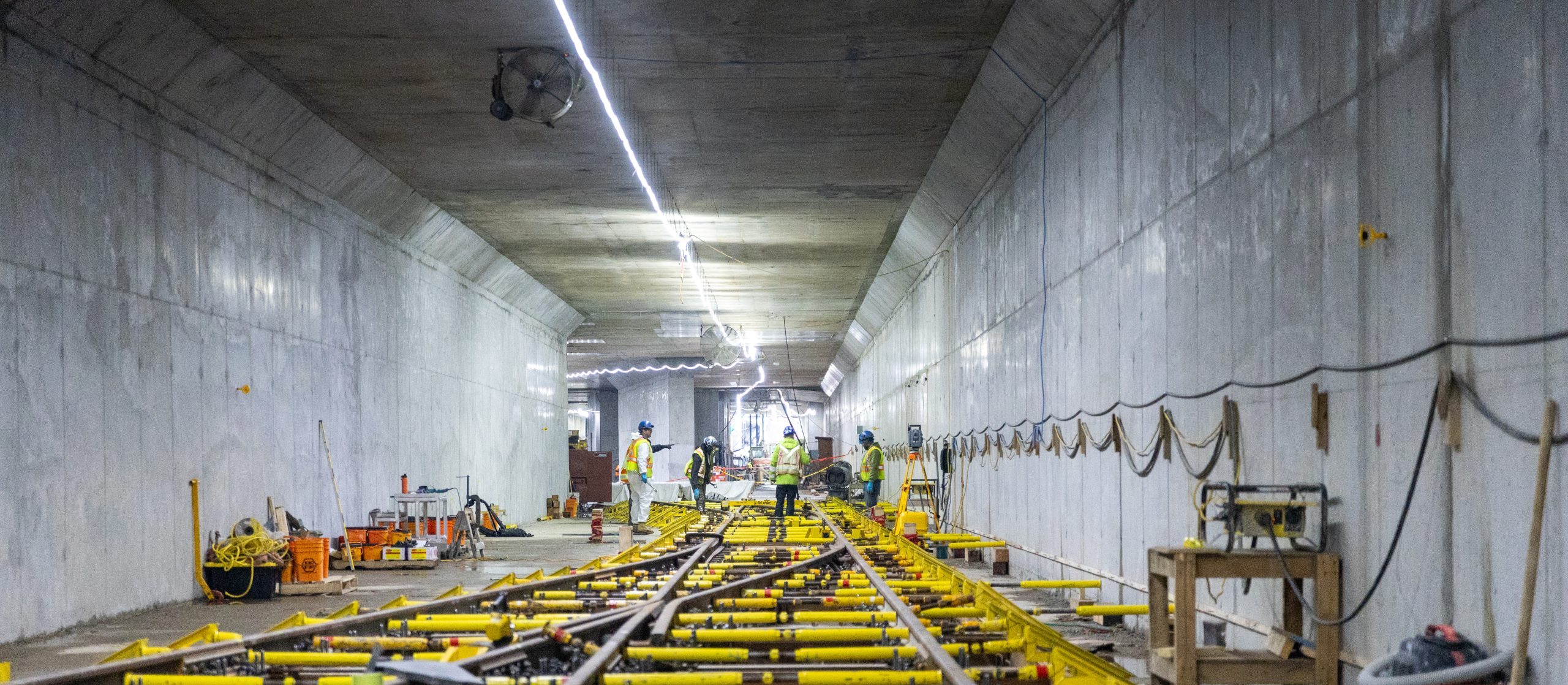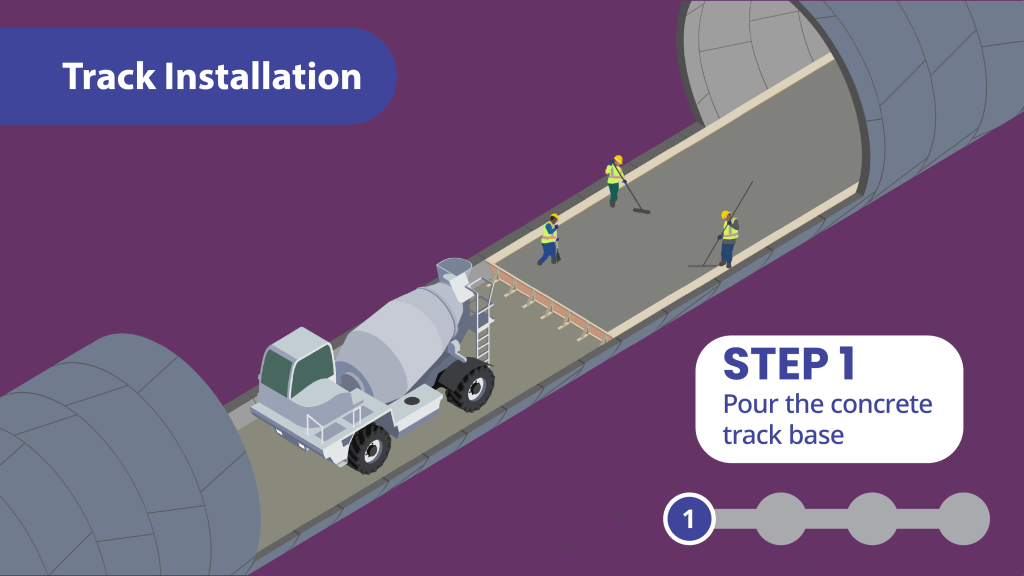 Before SkyTrain tracks can be installed inside, crews first construct a flat concrete base.