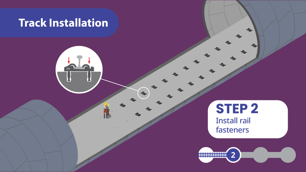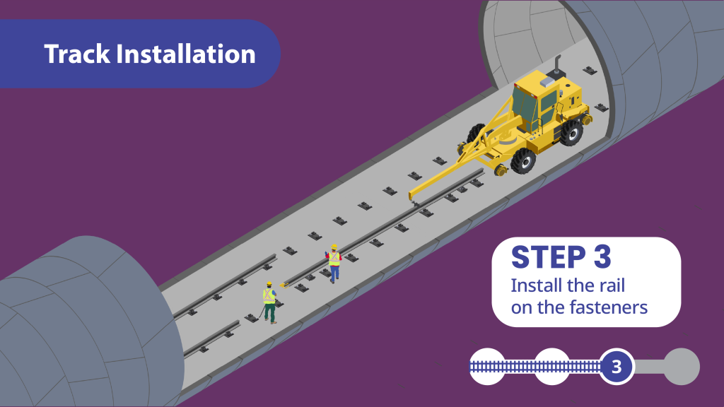 A specialized machine, called a speed swing, pulls the rail into the tunnel along rollers, stacks them within the tunnel, and then places them onto the fasteners when ready to install.
