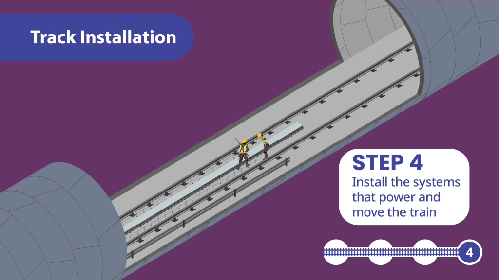 This includes the Linear Induction Motor rail, which runs down the middle of the track and helps move and stop the train, and the power rail, which runs on the side of the track and supplies energy to operate the train.