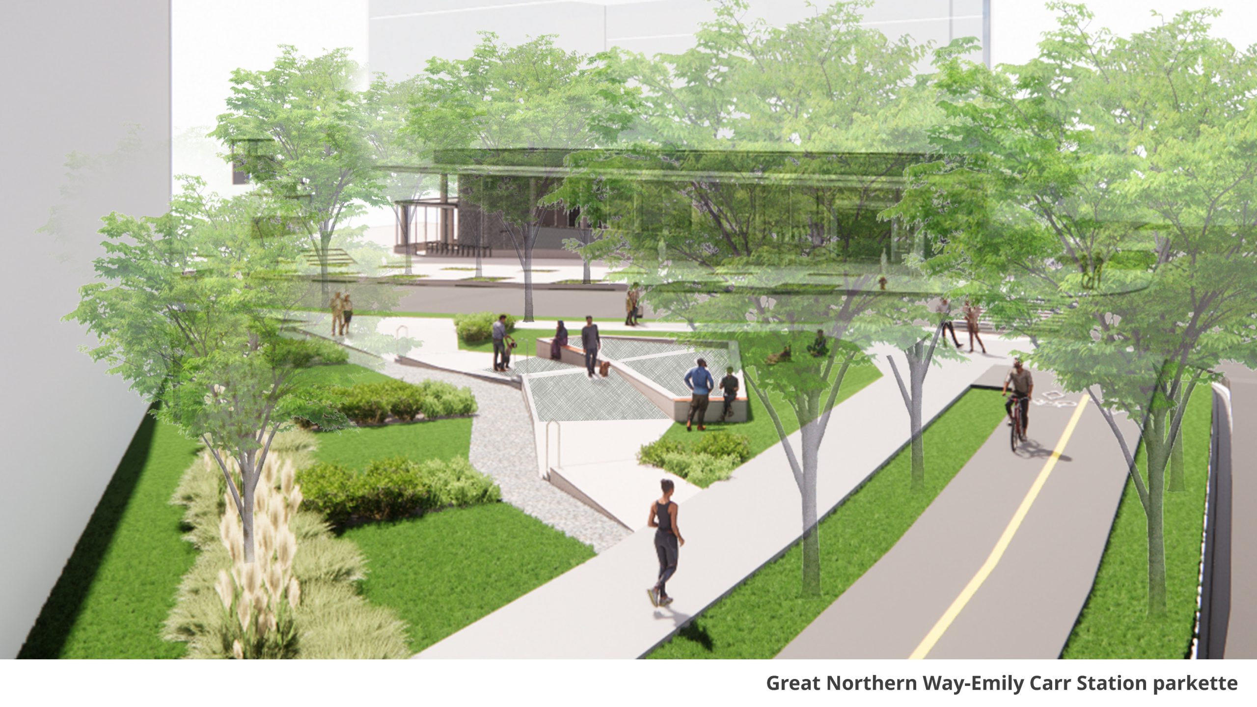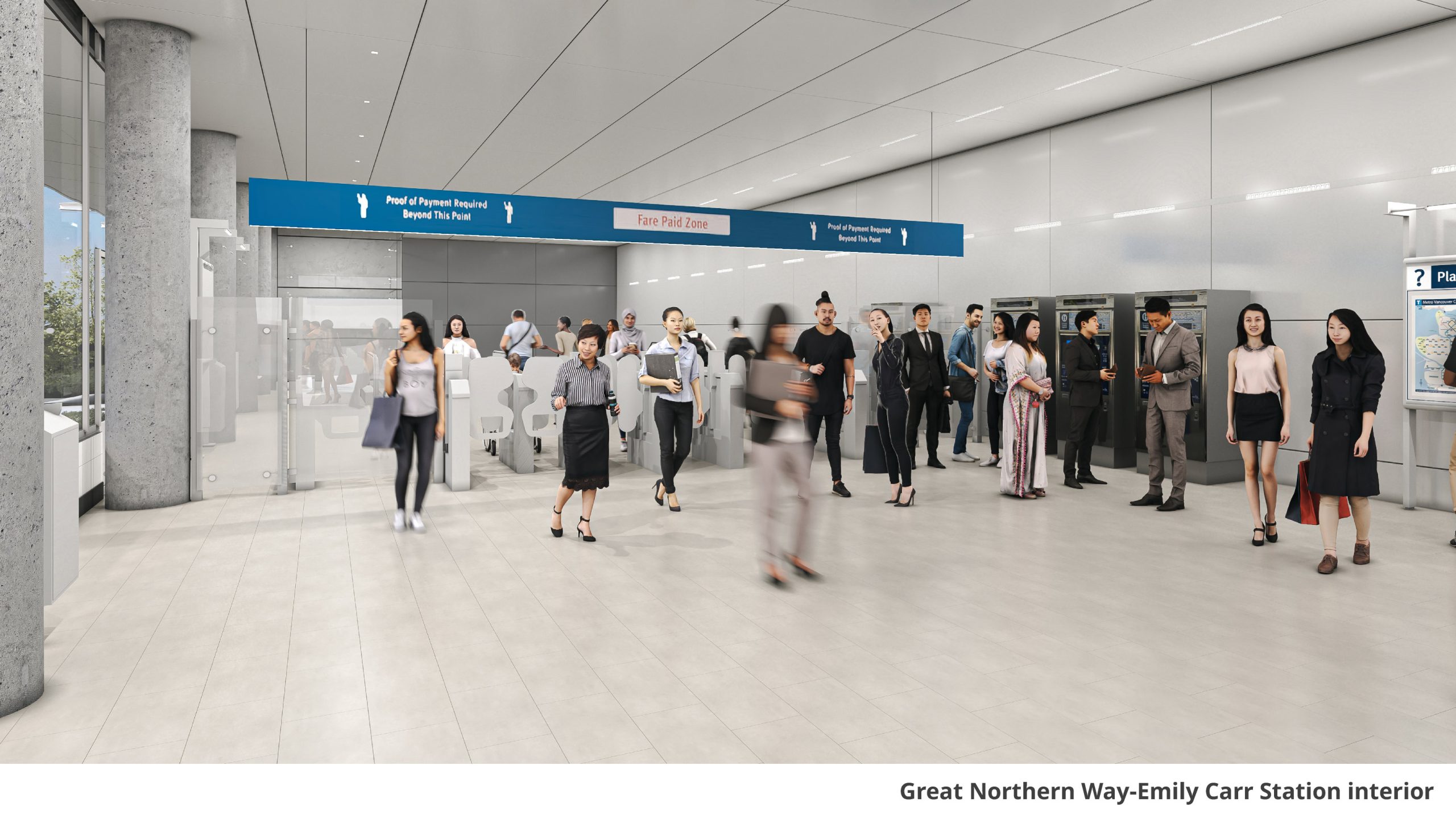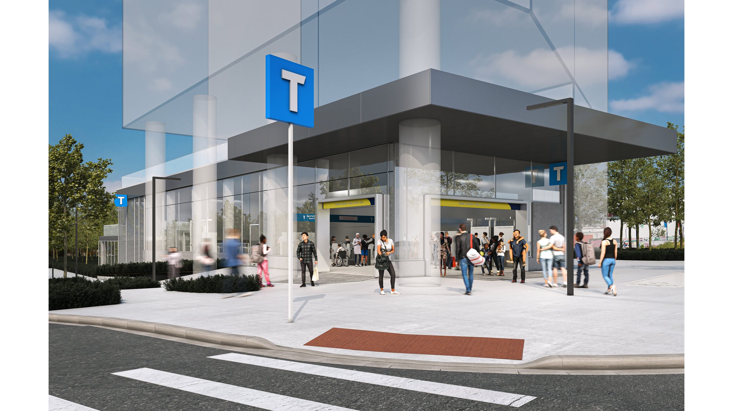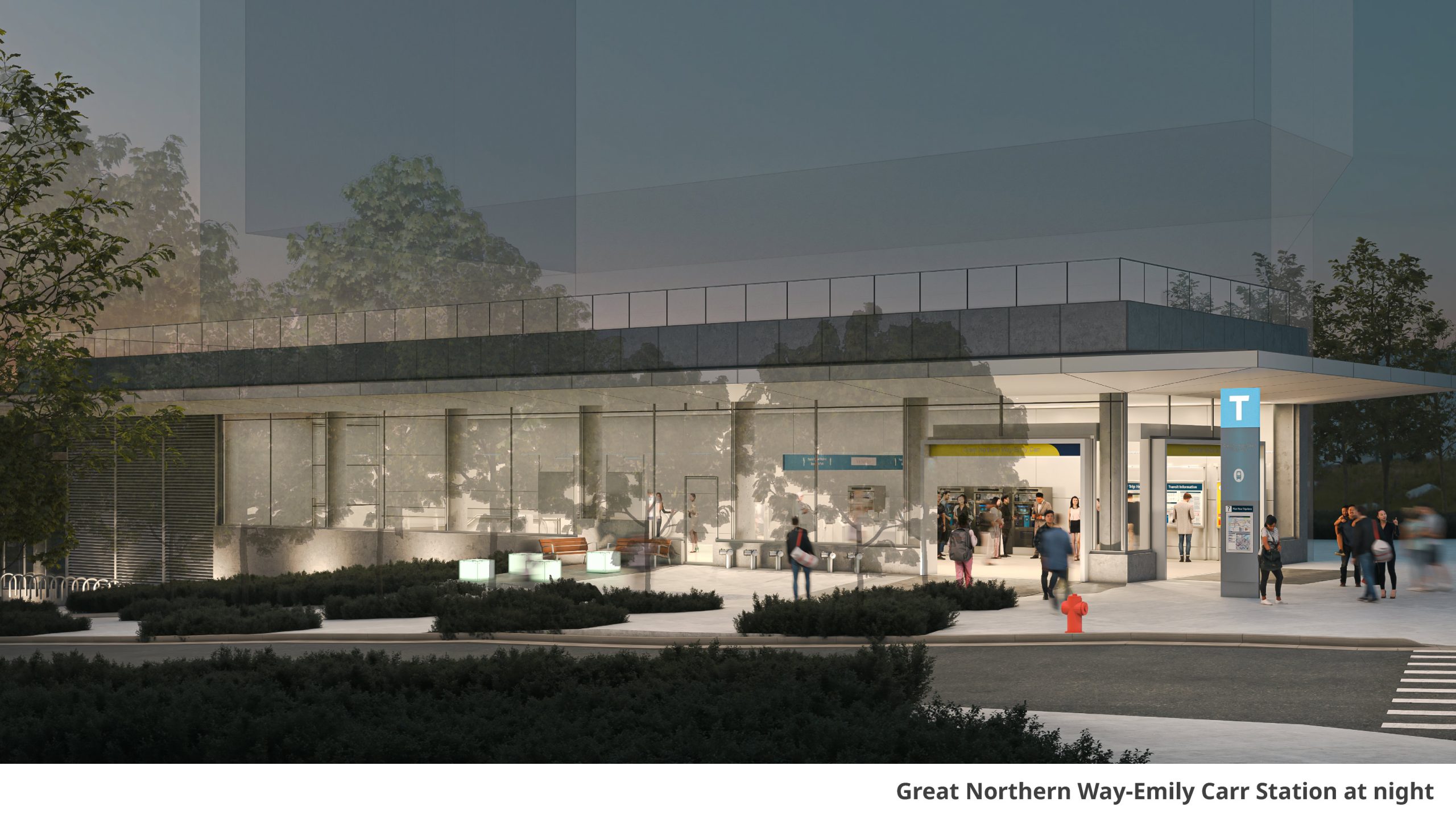 Between November 2020 and May 2021, two virtual open houses were held to present draft designs for the above-ground portions of the future stations, including entrances, adjacent plazas, emergency exits and ventilation locations, landscaping, and station art. Feedback received was provided as input to the City of Vancouver’s design advisory process and considered in finalizing the stations’ designs. Renderings shared as part of this process can be seen below. More information available here.