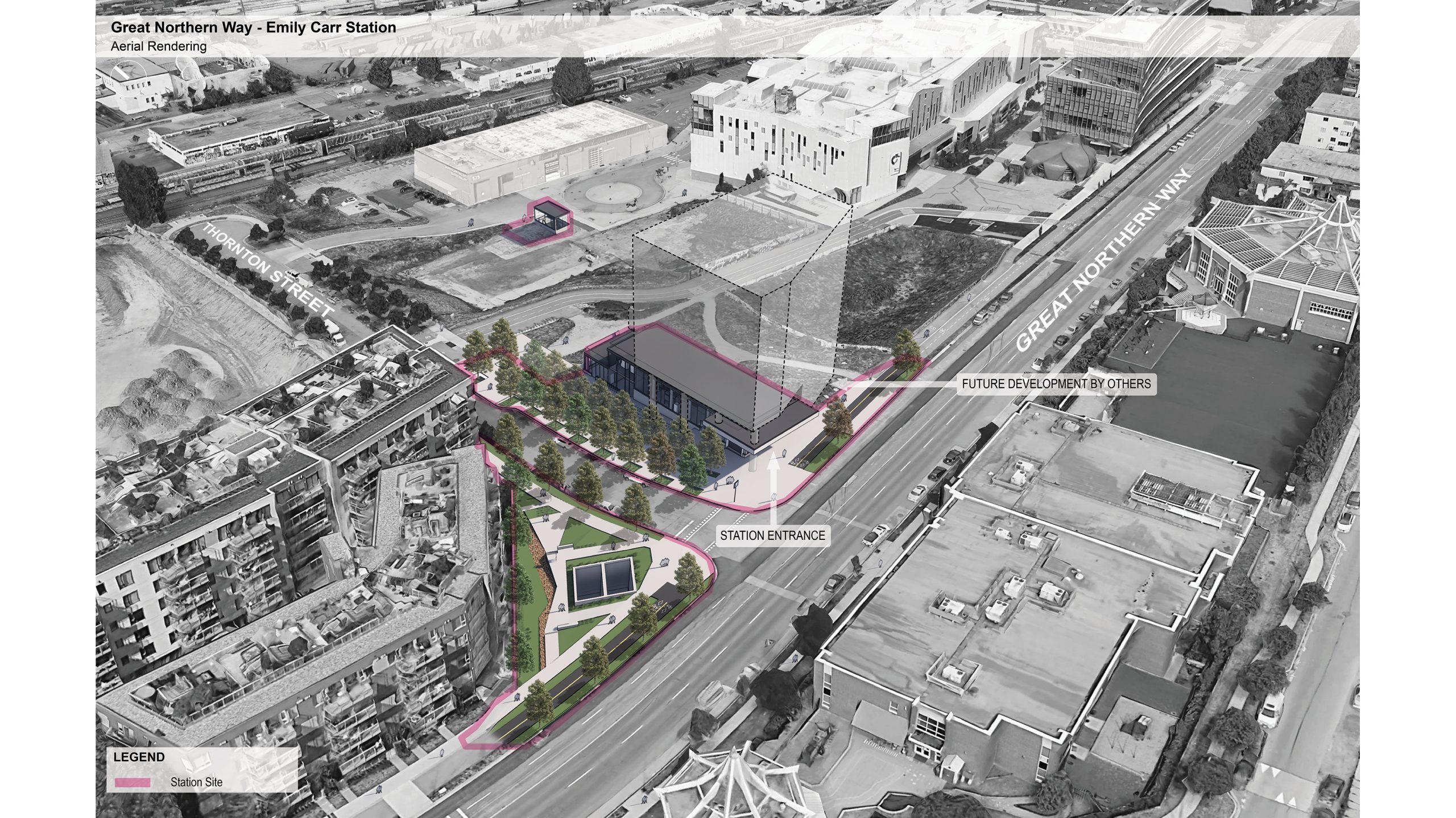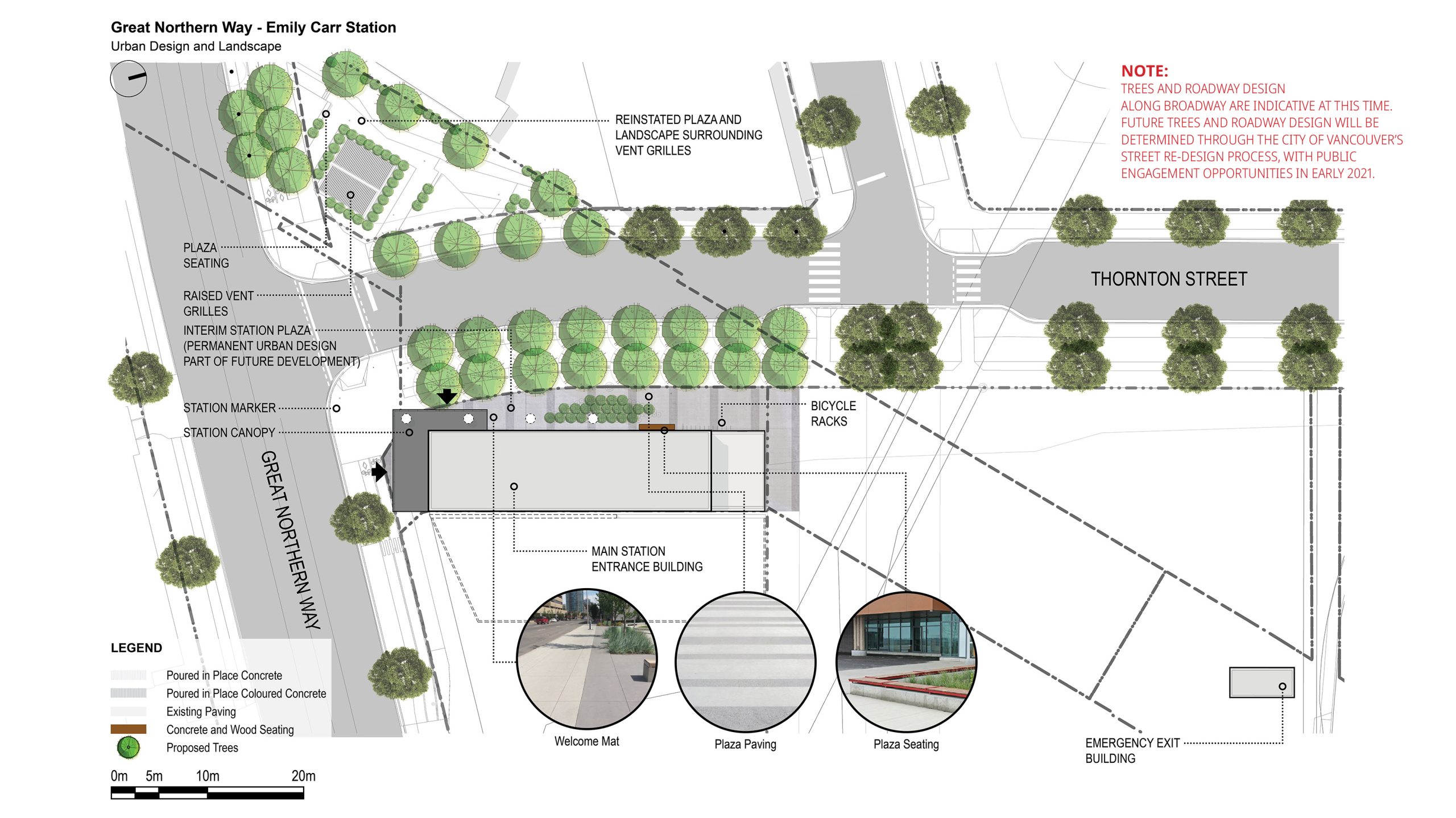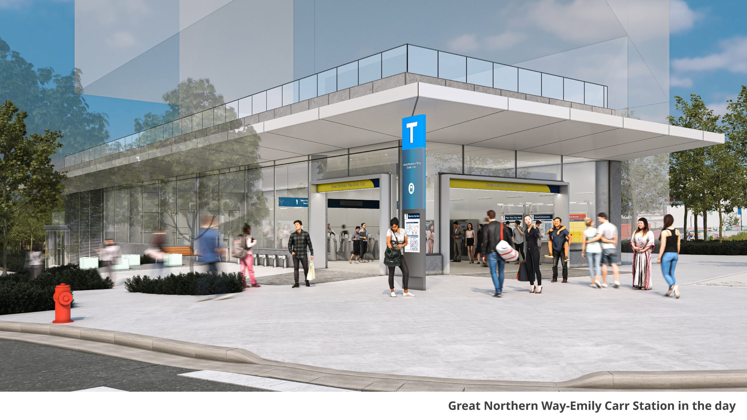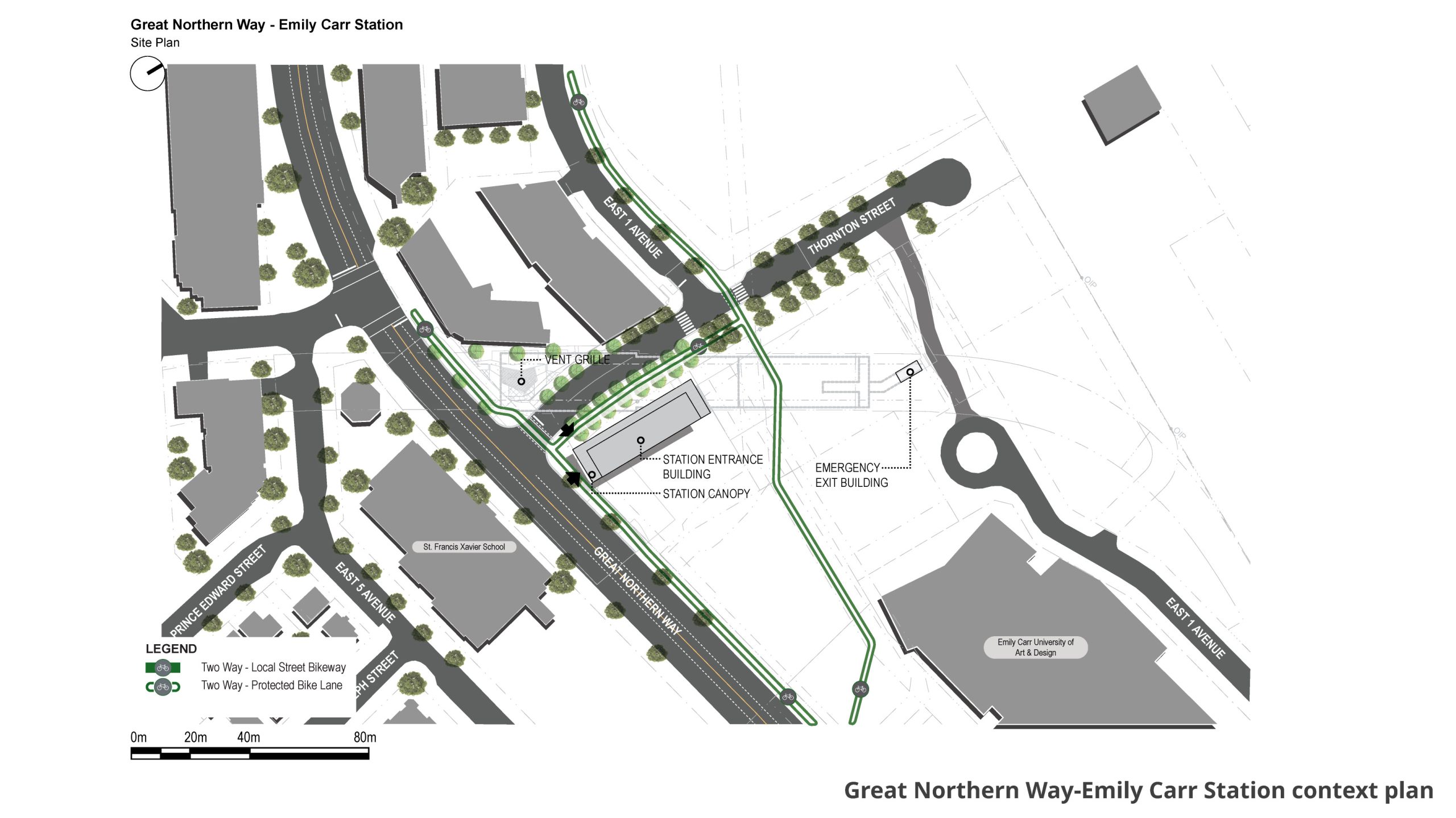 Between November 2020 and May 2021, two virtual open houses were held to present draft designs for the above-ground portions of the future stations, including entrances, adjacent plazas, emergency exits and ventilation locations, landscaping, and station art. Feedback received was provided as input to the City of Vancouver’s design advisory process and considered in finalizing the stations’ designs. Renderings shared as part of this process can be seen below. More information available here.