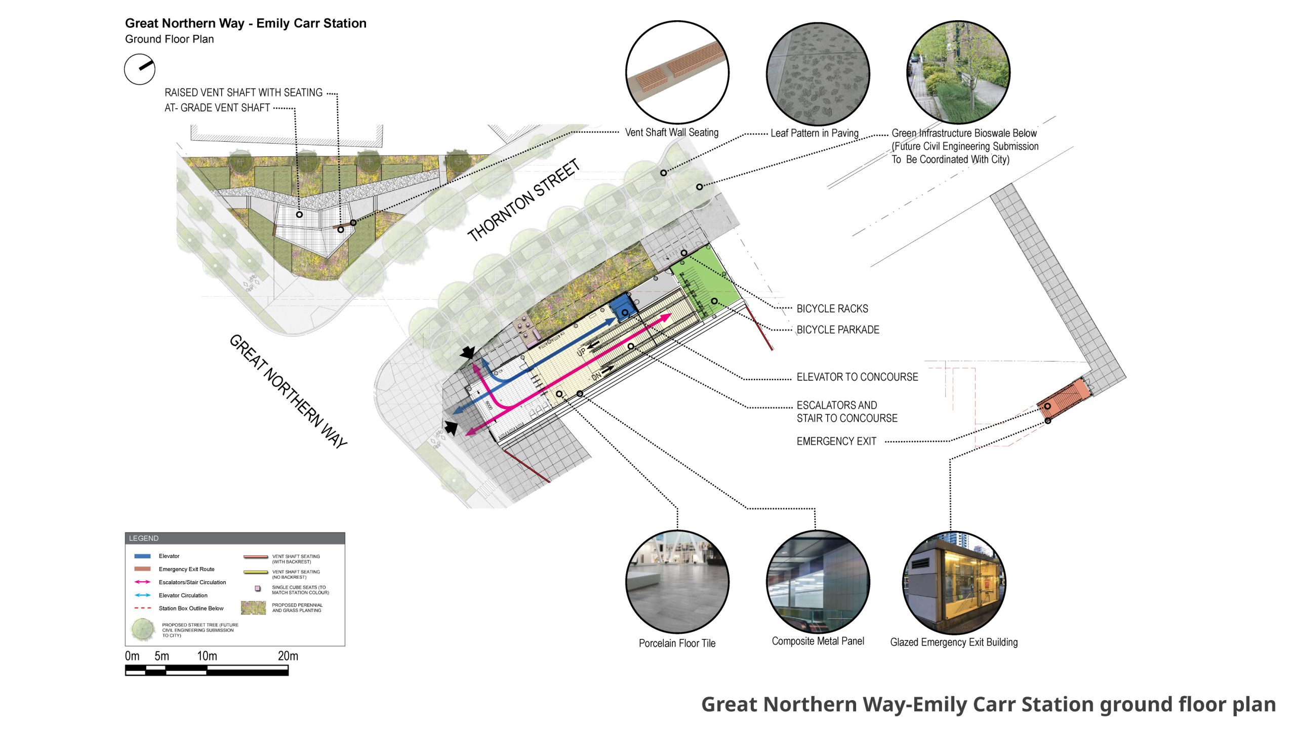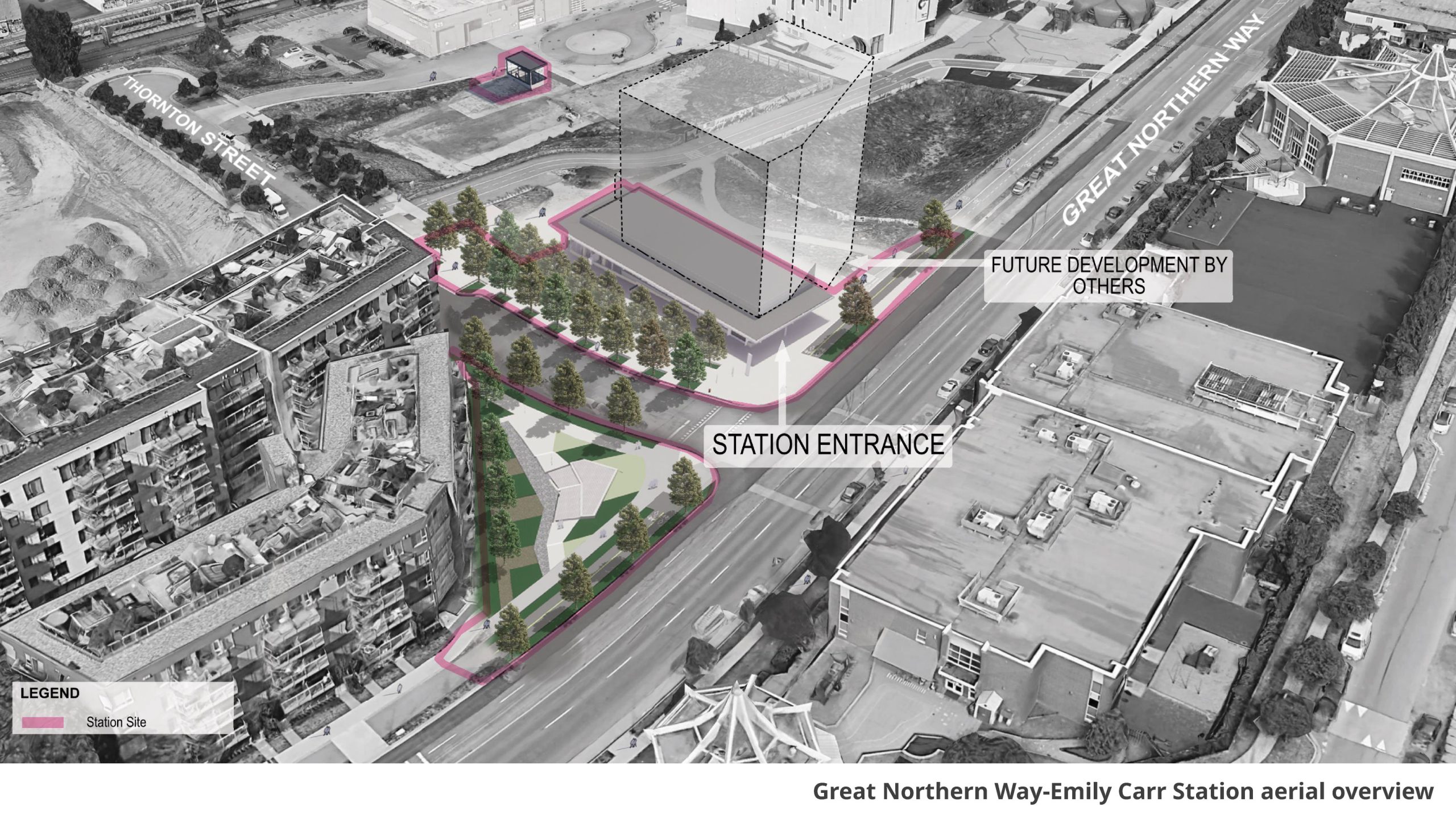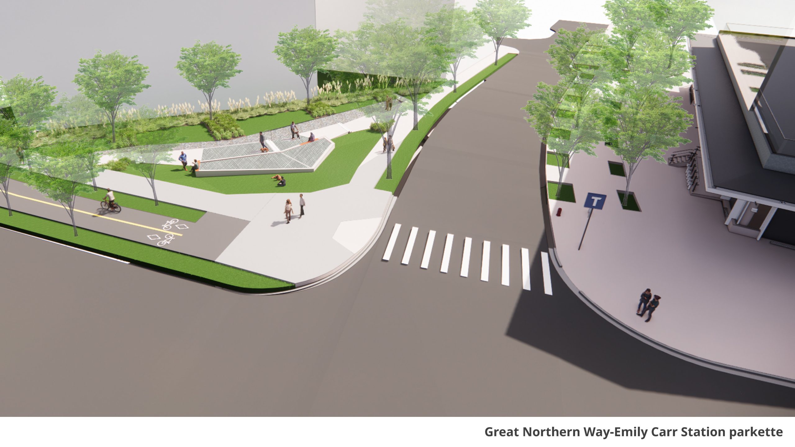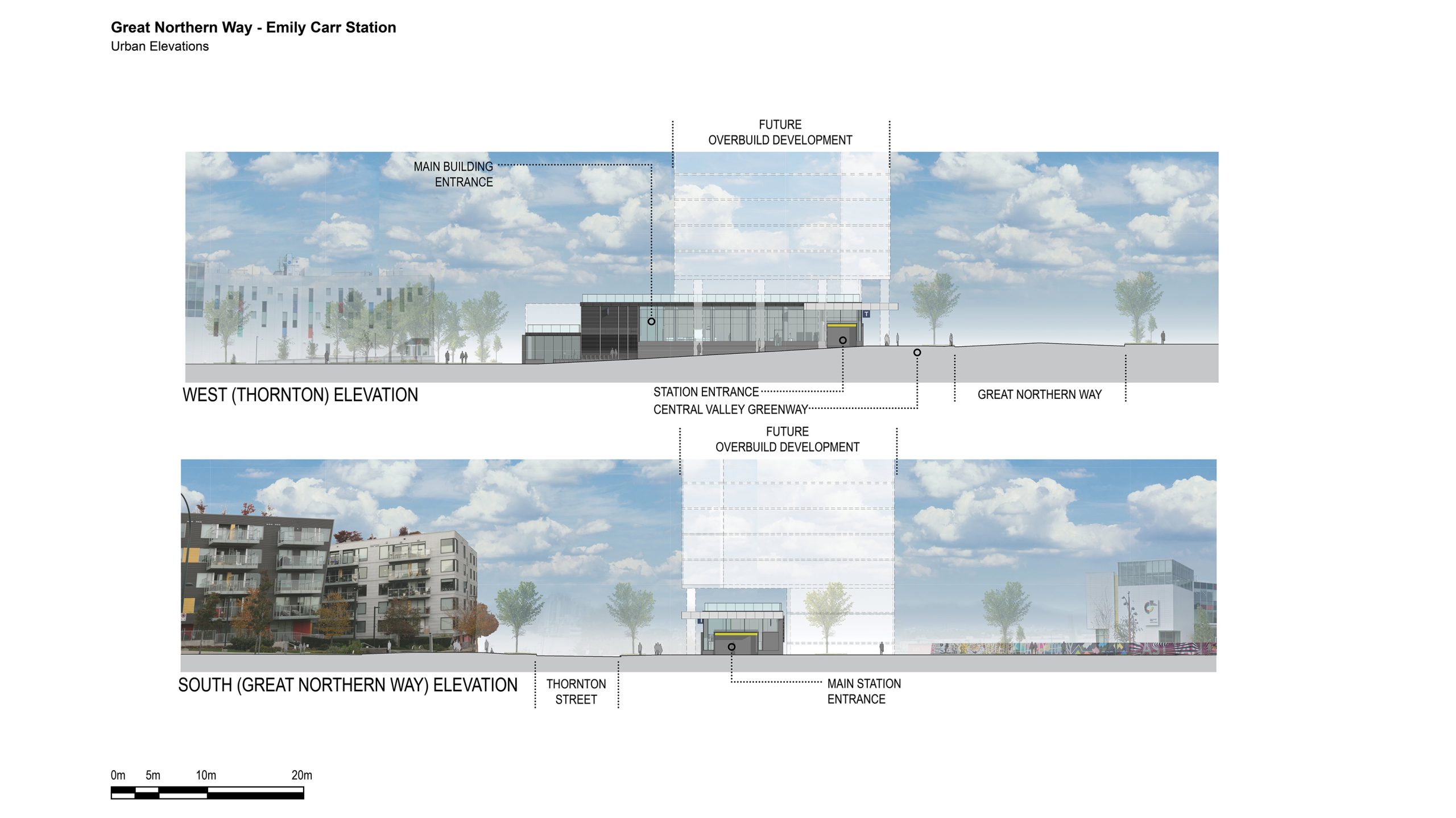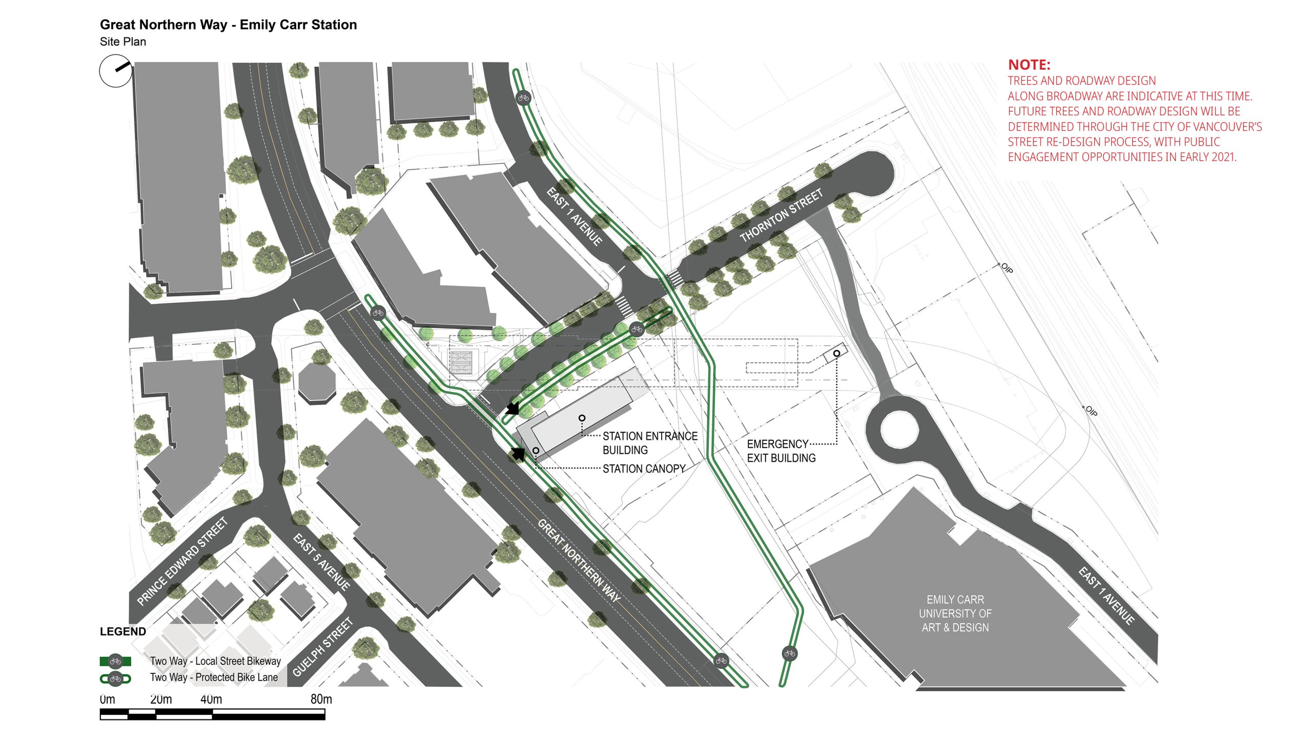 Between November 2020 and May 2021, two virtual open houses were held to present draft designs for the above-ground portions of the future stations, including entrances, adjacent plazas, emergency exits and ventilation locations, landscaping, and station art. Feedback received was provided as input to the City of Vancouver’s design advisory process and considered in finalizing the stations’ designs. Renderings shared as part of this process can be seen below. More information available here.