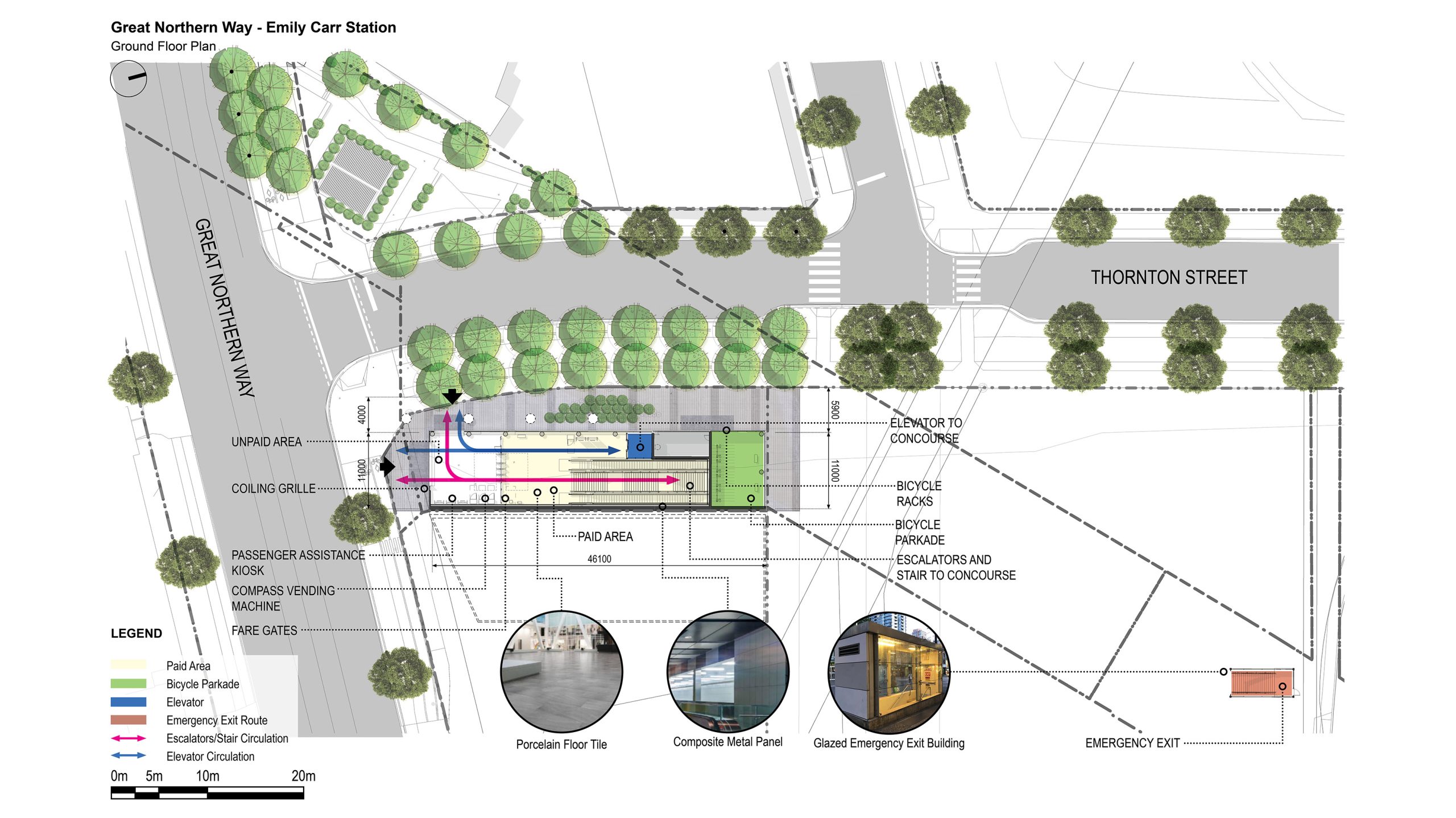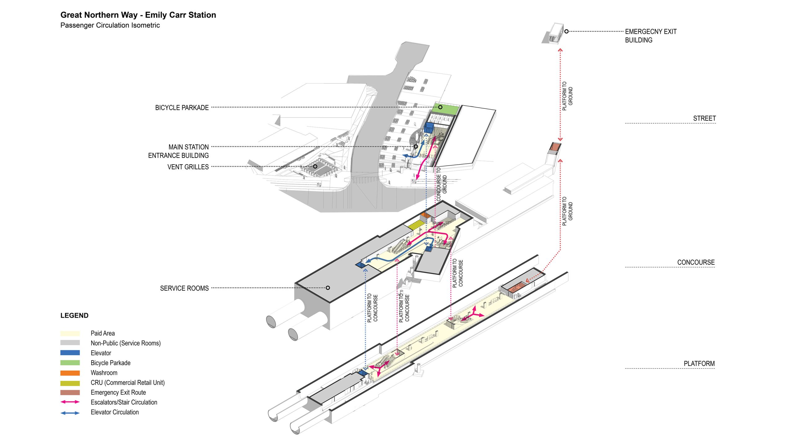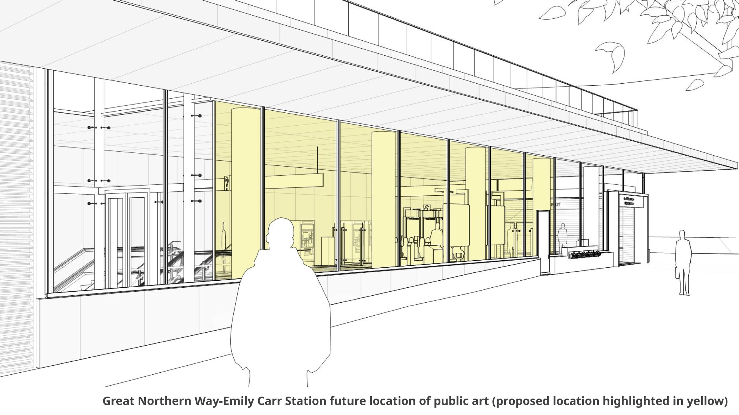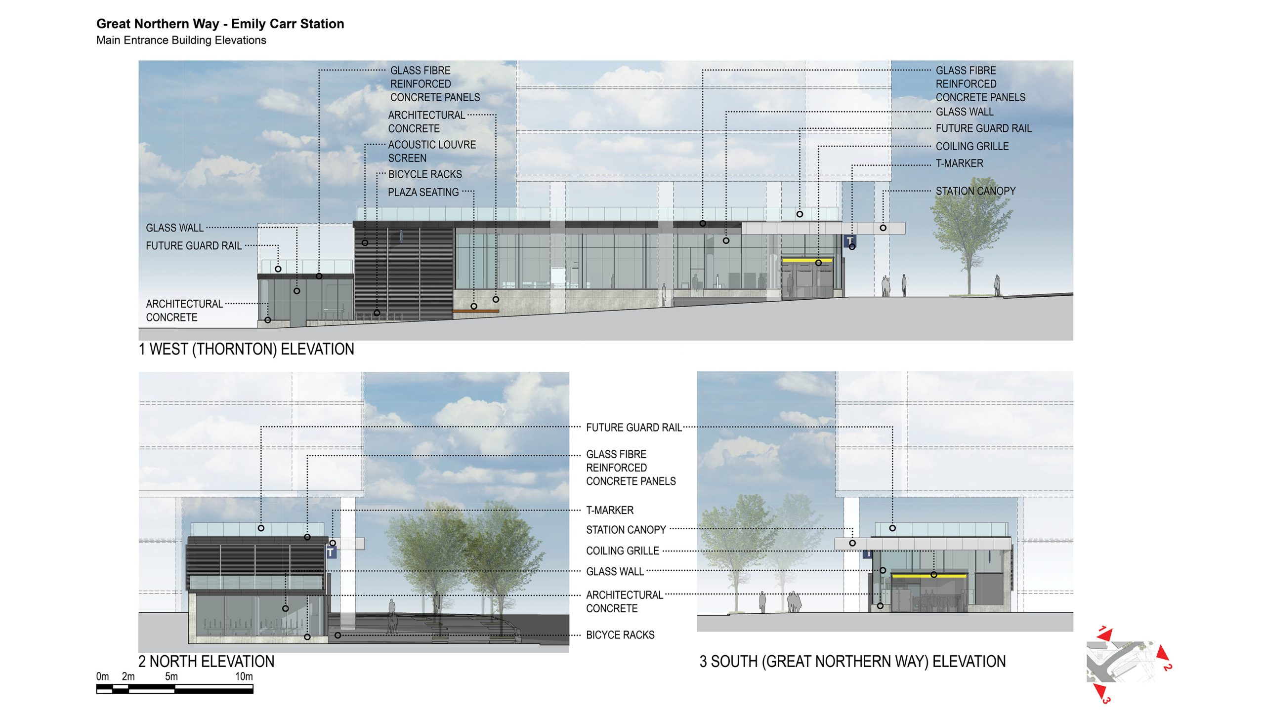 Between November 2020 and May 2021, two virtual open houses were held to present draft designs for the above-ground portions of the future stations, including entrances, adjacent plazas, emergency exits and ventilation locations, landscaping, and station art. Feedback received was provided as input to the City of Vancouver’s design advisory process and considered in finalizing the stations’ designs. Renderings shared as part of this process can be seen below. More information available here.