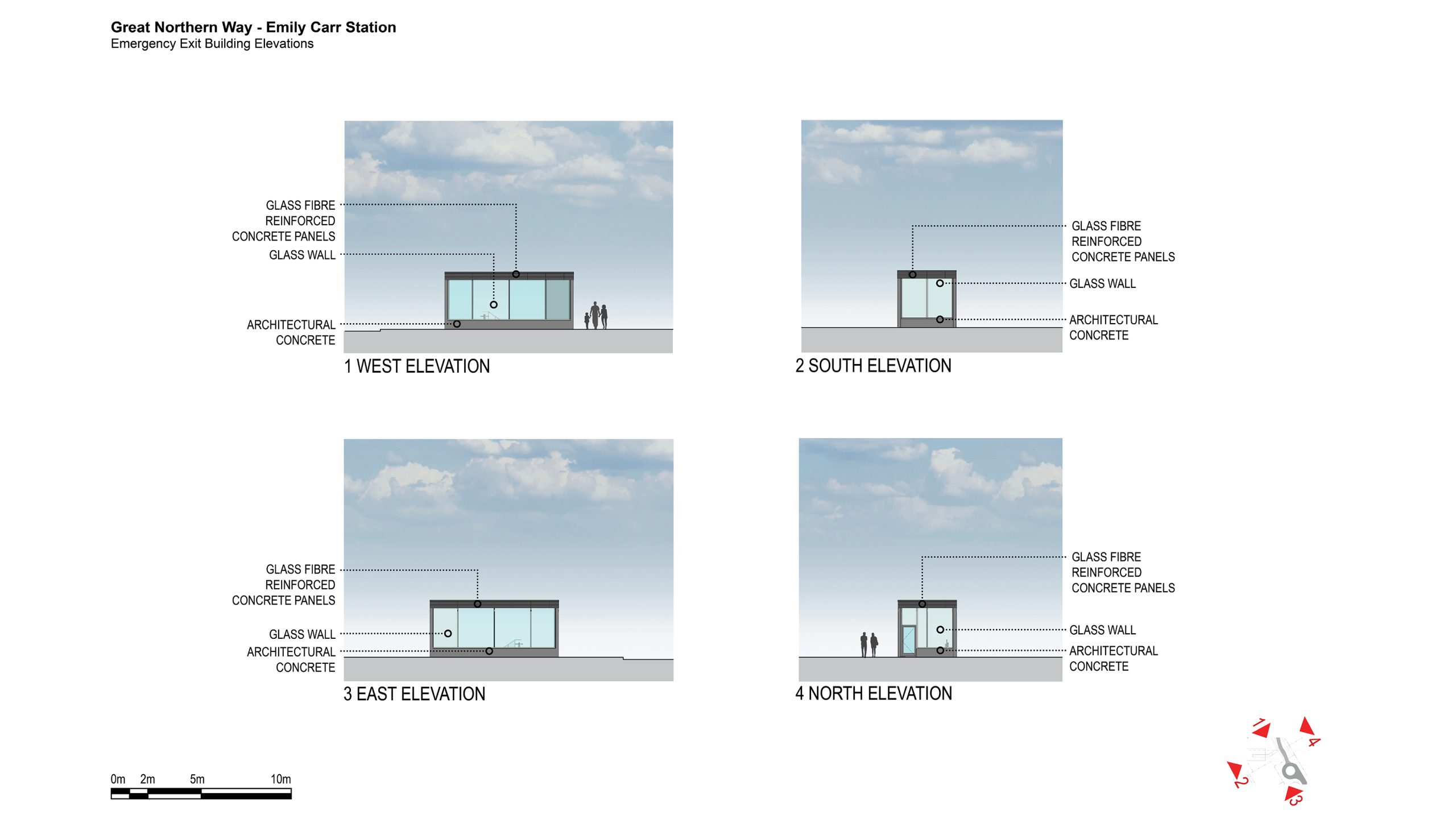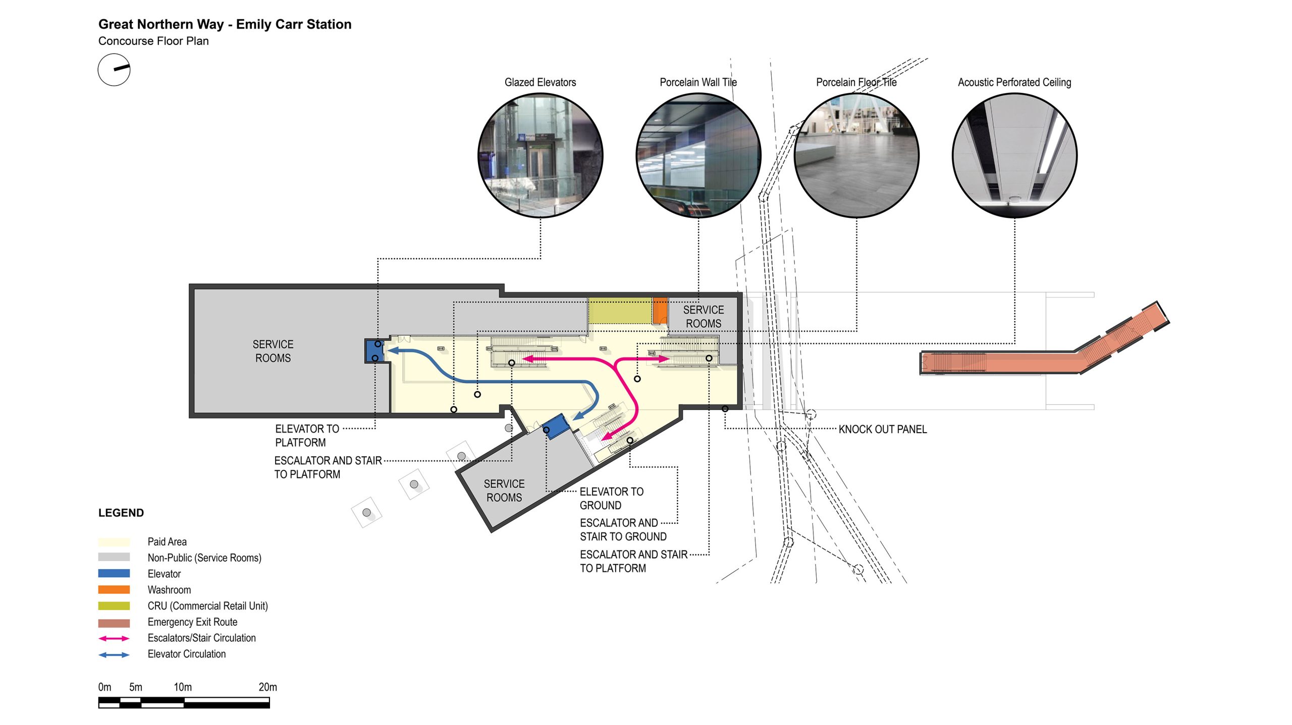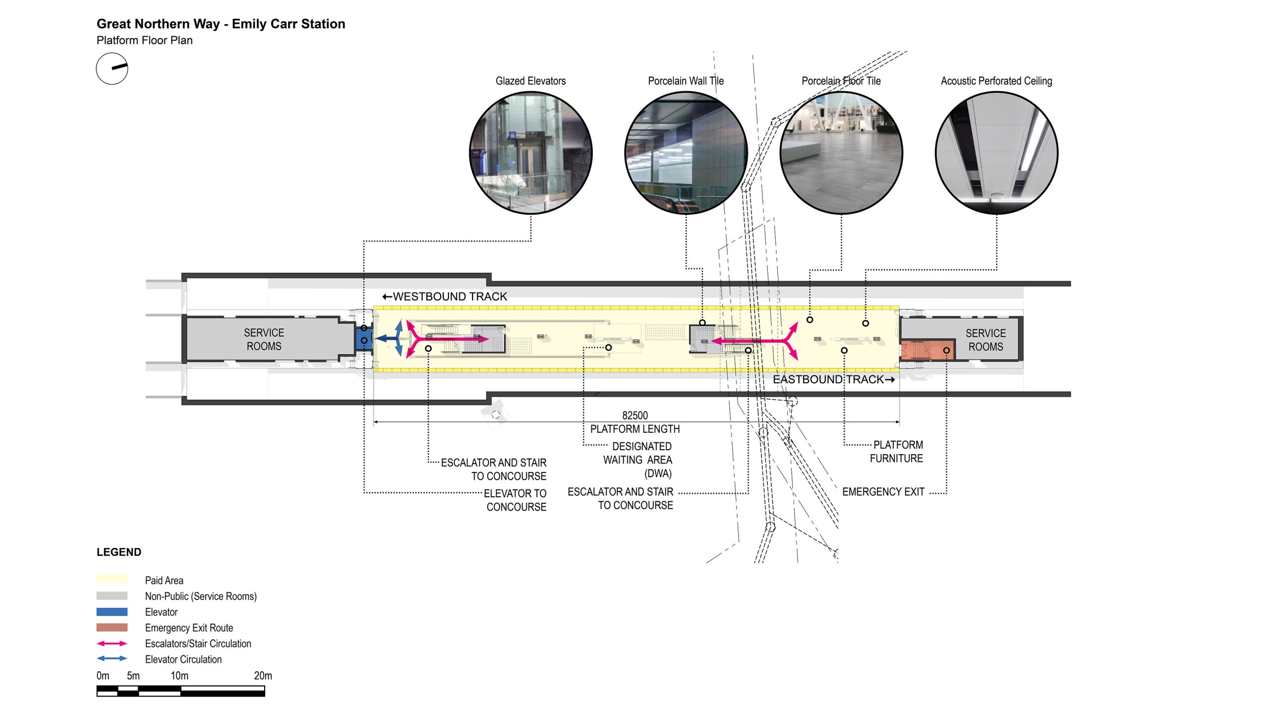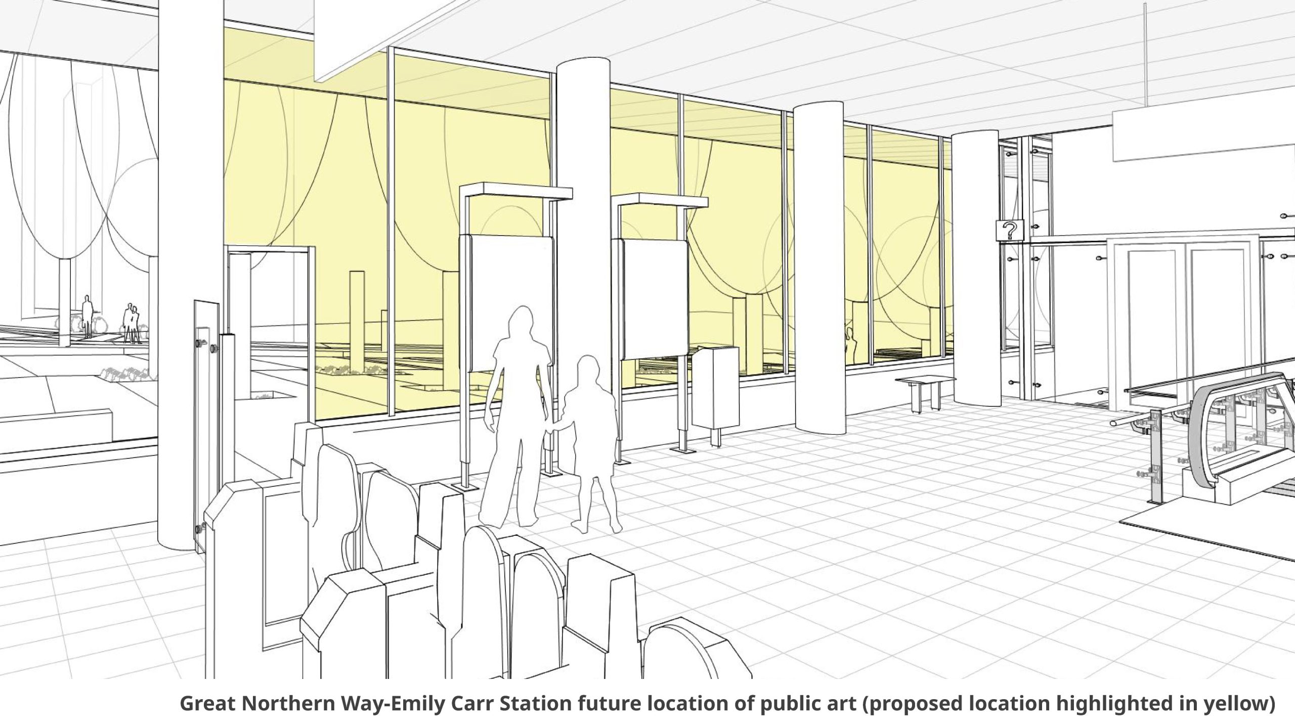Between November 2020 and May 2021, two virtual open houses were held to present draft designs for the above-ground portions of the future stations, including entrances, adjacent plazas, emergency exits and ventilation locations, landscaping, and station art. Feedback received was provided as input to the City of Vancouver’s design advisory process and considered in finalizing the stations’ designs. Renderings shared as part of this process can be seen below. More information available here.