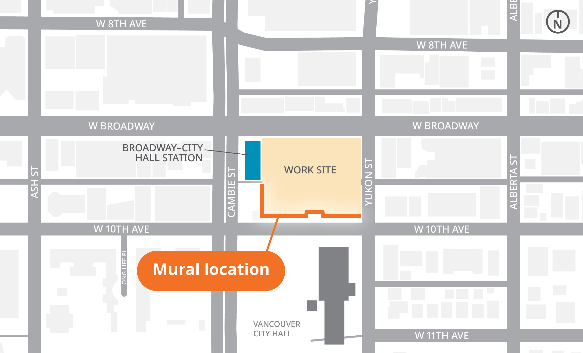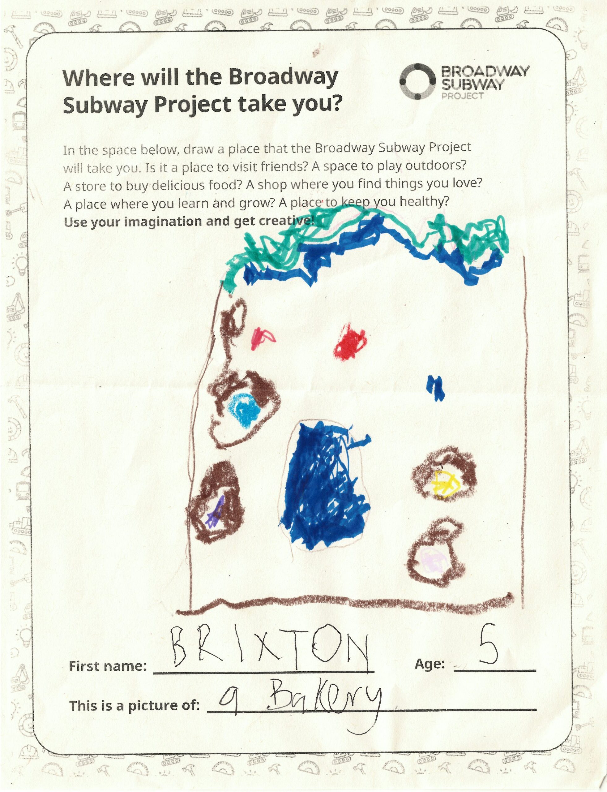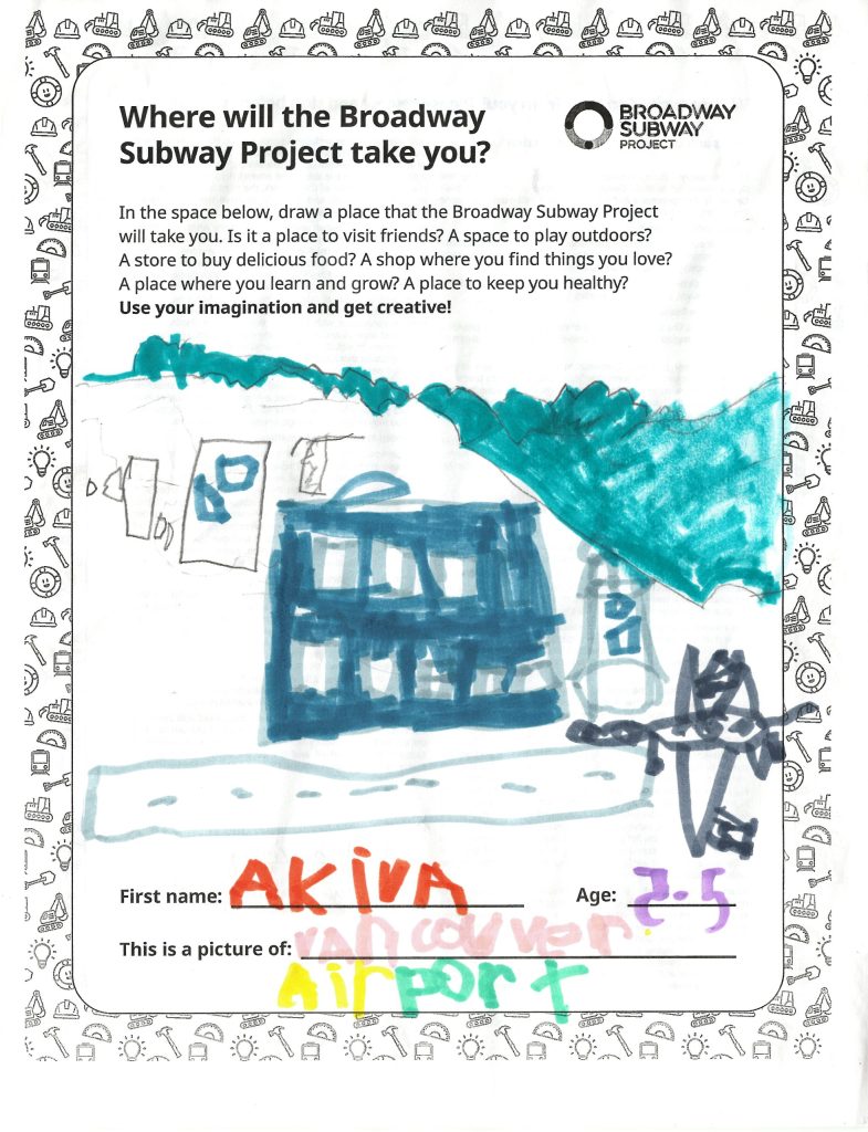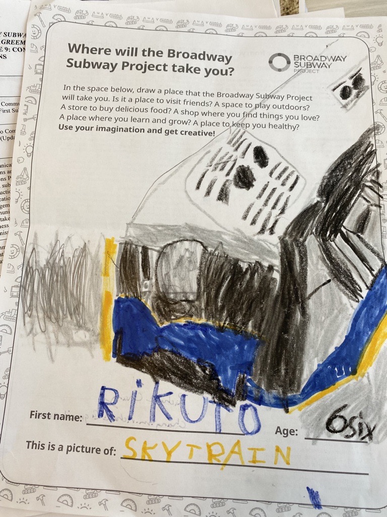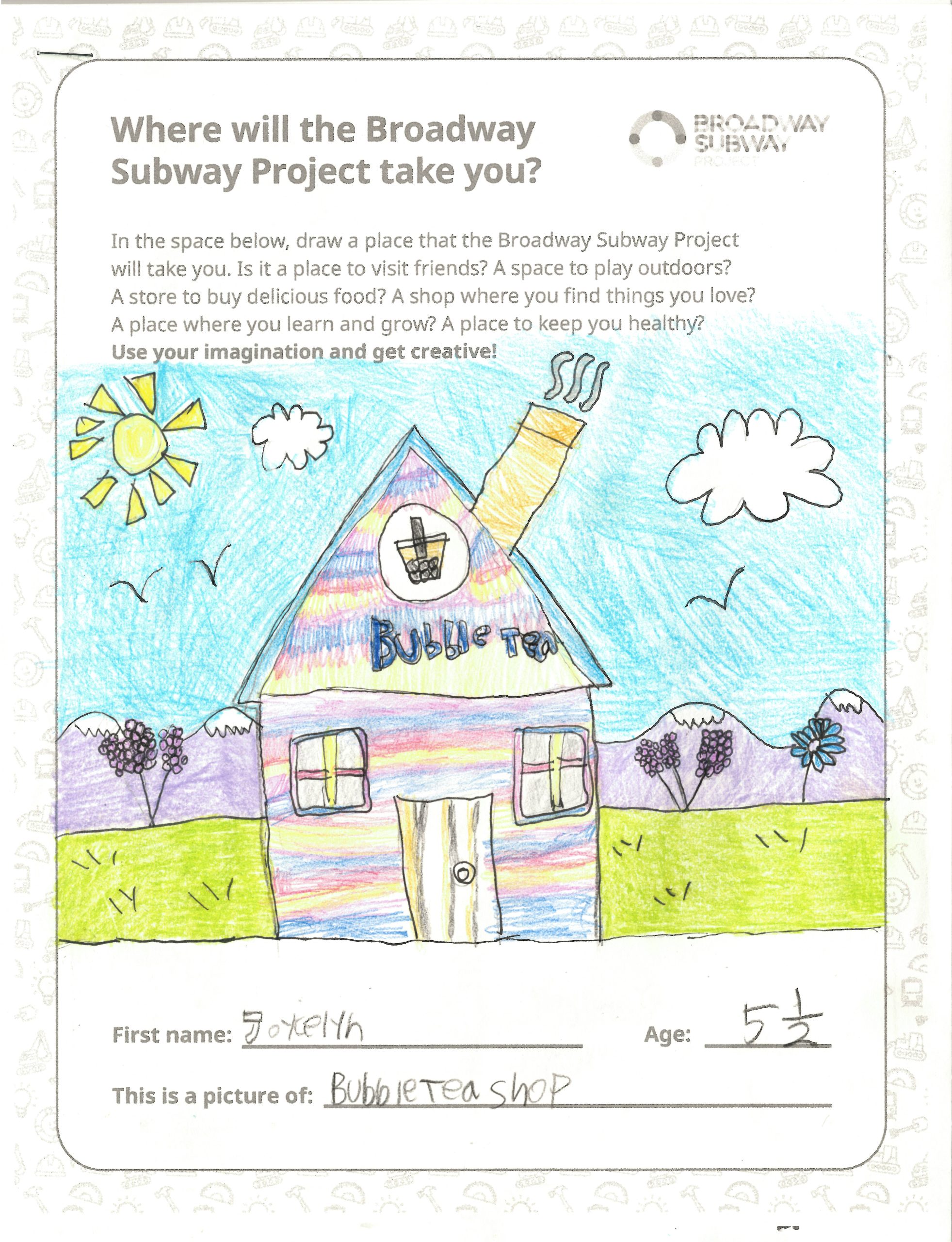 We asked kids aged 12 and under to answer this question in their art, and they delivered. The artwork below was submitted to the Project in 2023 and the first instalment is now on display at the Broadway-City Hall Station site as part of a temporary mural facing Cambie Street and 10th Avenue.