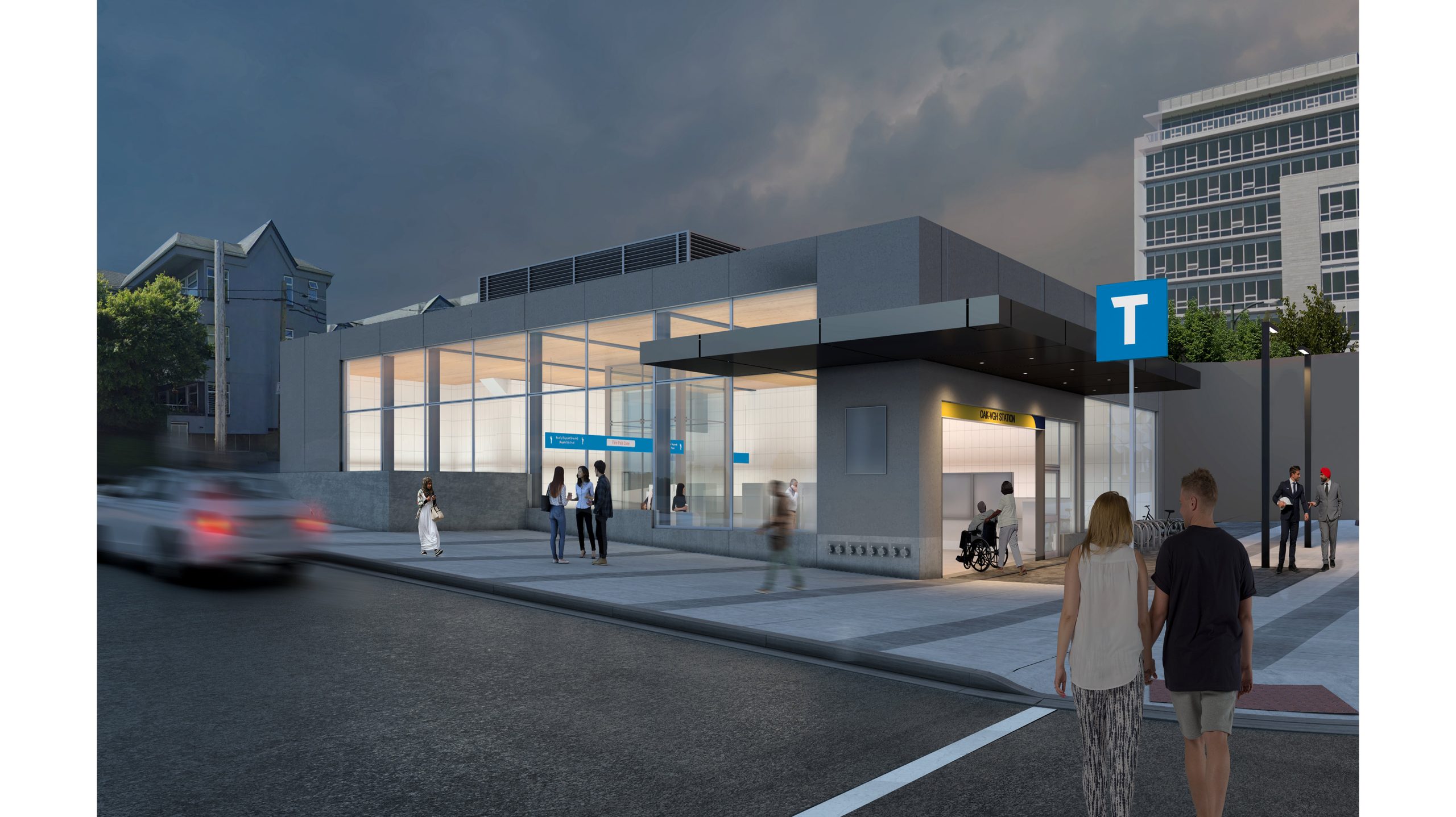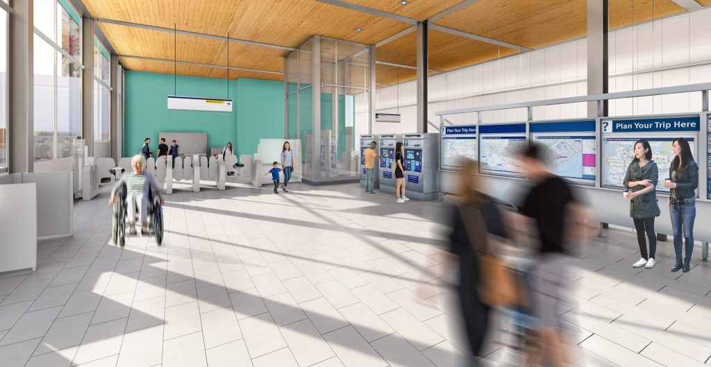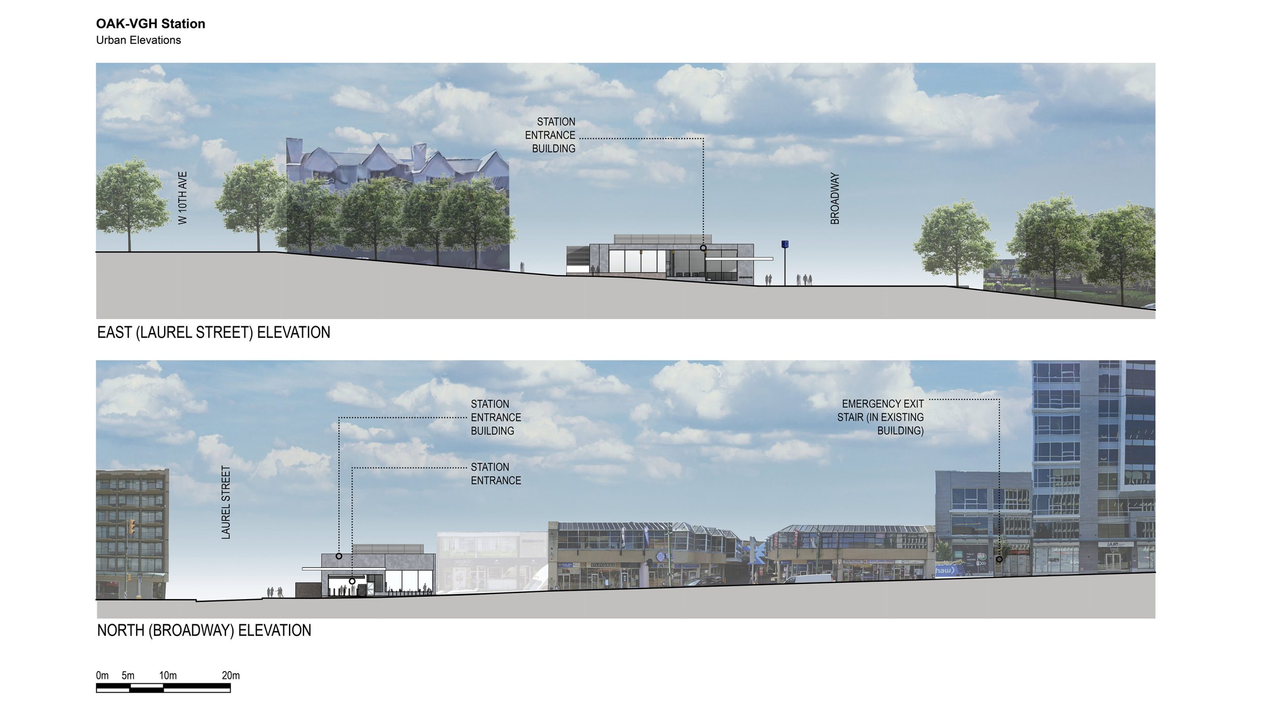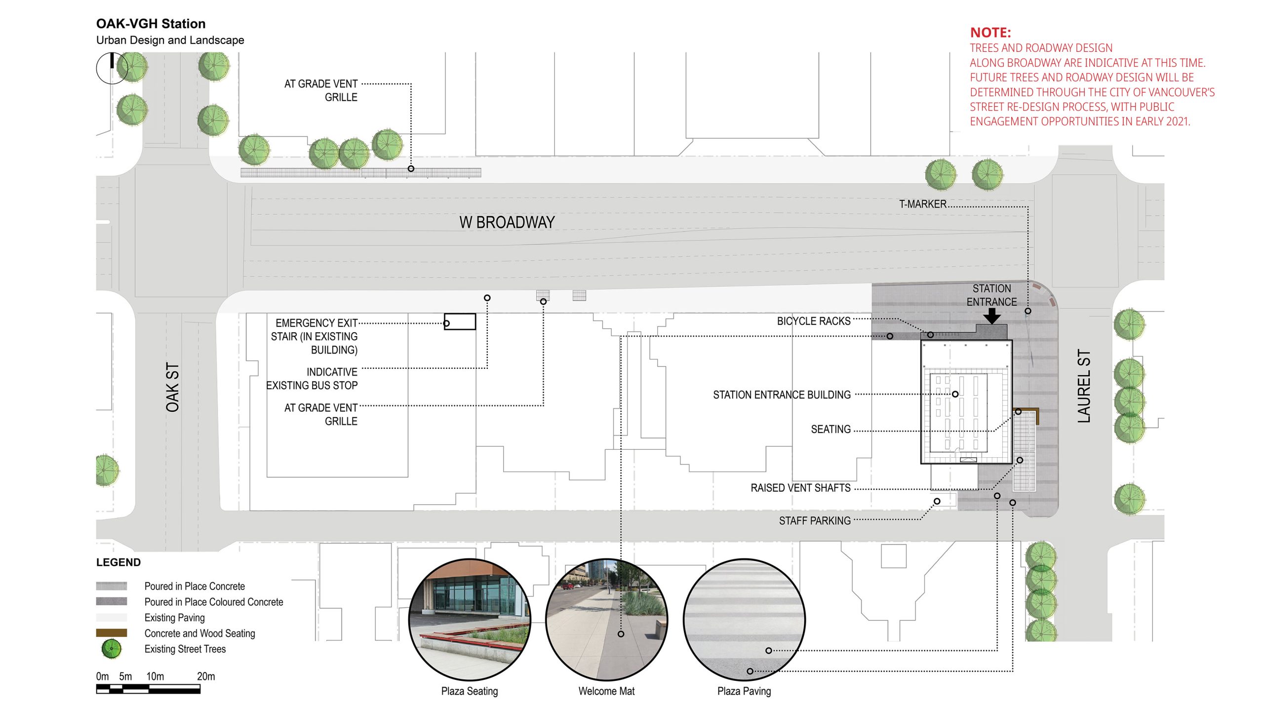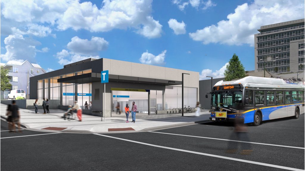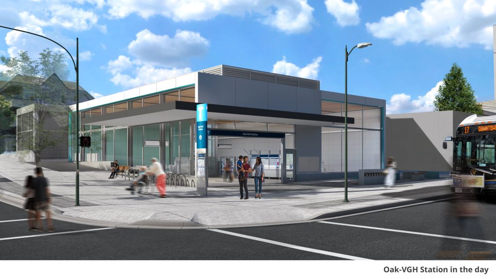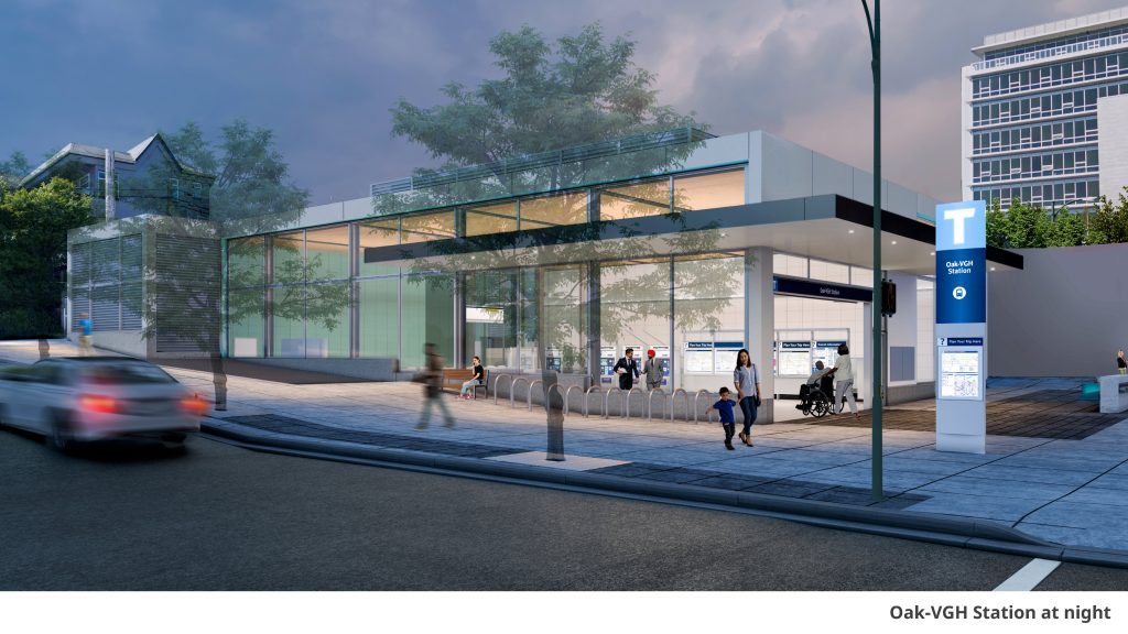 Between November 2020 and May 2021, two virtual open houses were held to present draft designs for the above-ground portions of the future stations, including entrances, adjacent plazas, emergency exits and ventilation locations, landscaping, and station art. Feedback received was provided as input to the City of Vancouver’s design advisory process and considered in finalizing the stations’ designs. Renderings shared as part of this process can be seen below. More information available here.