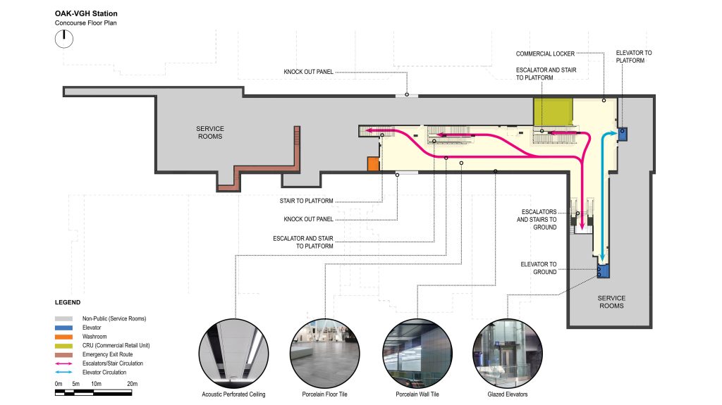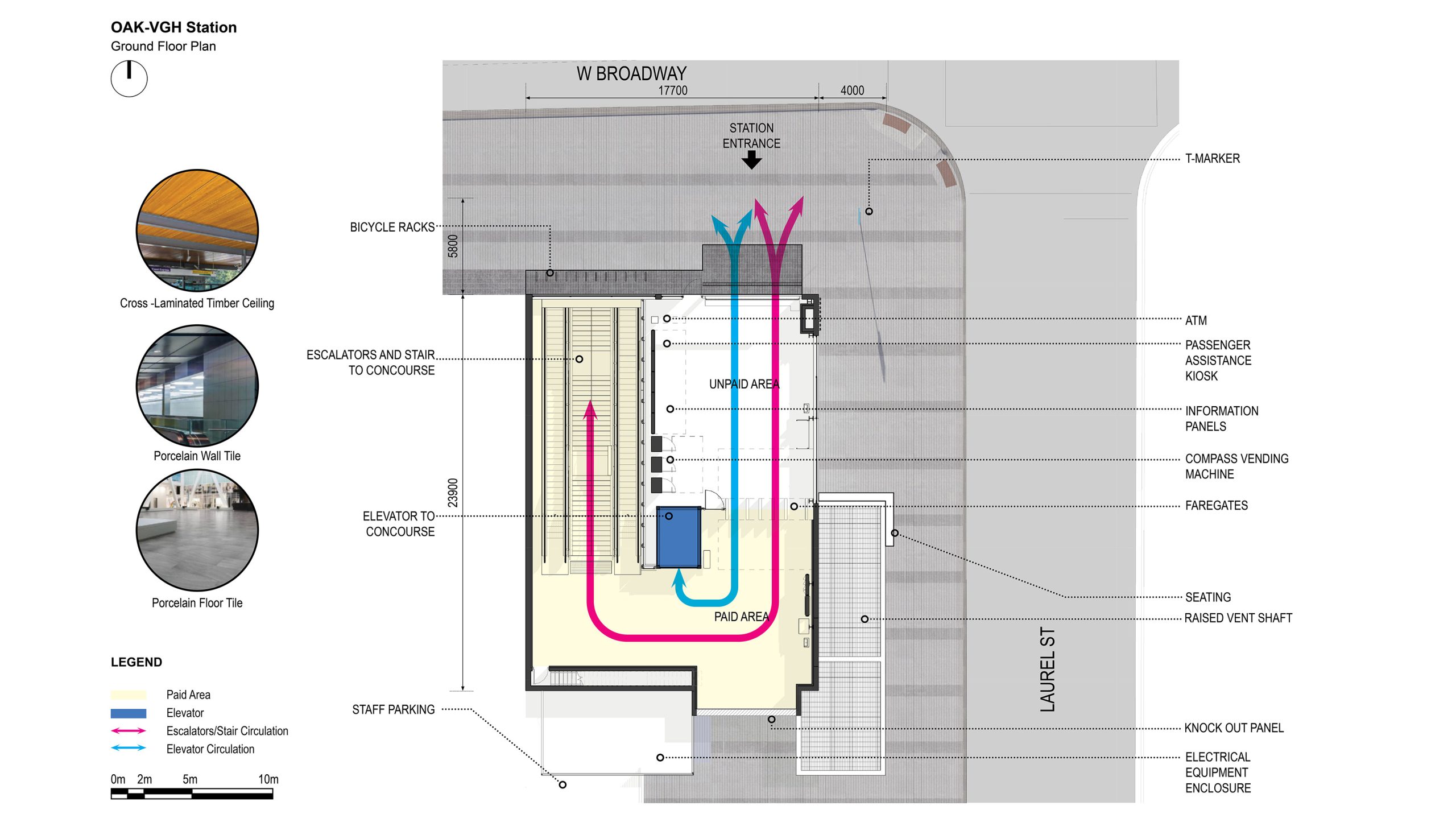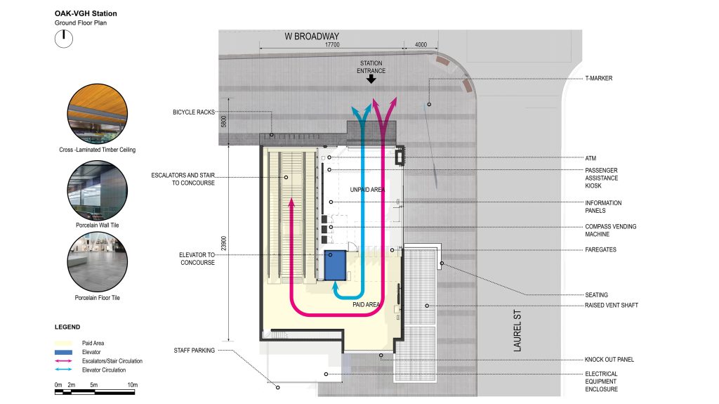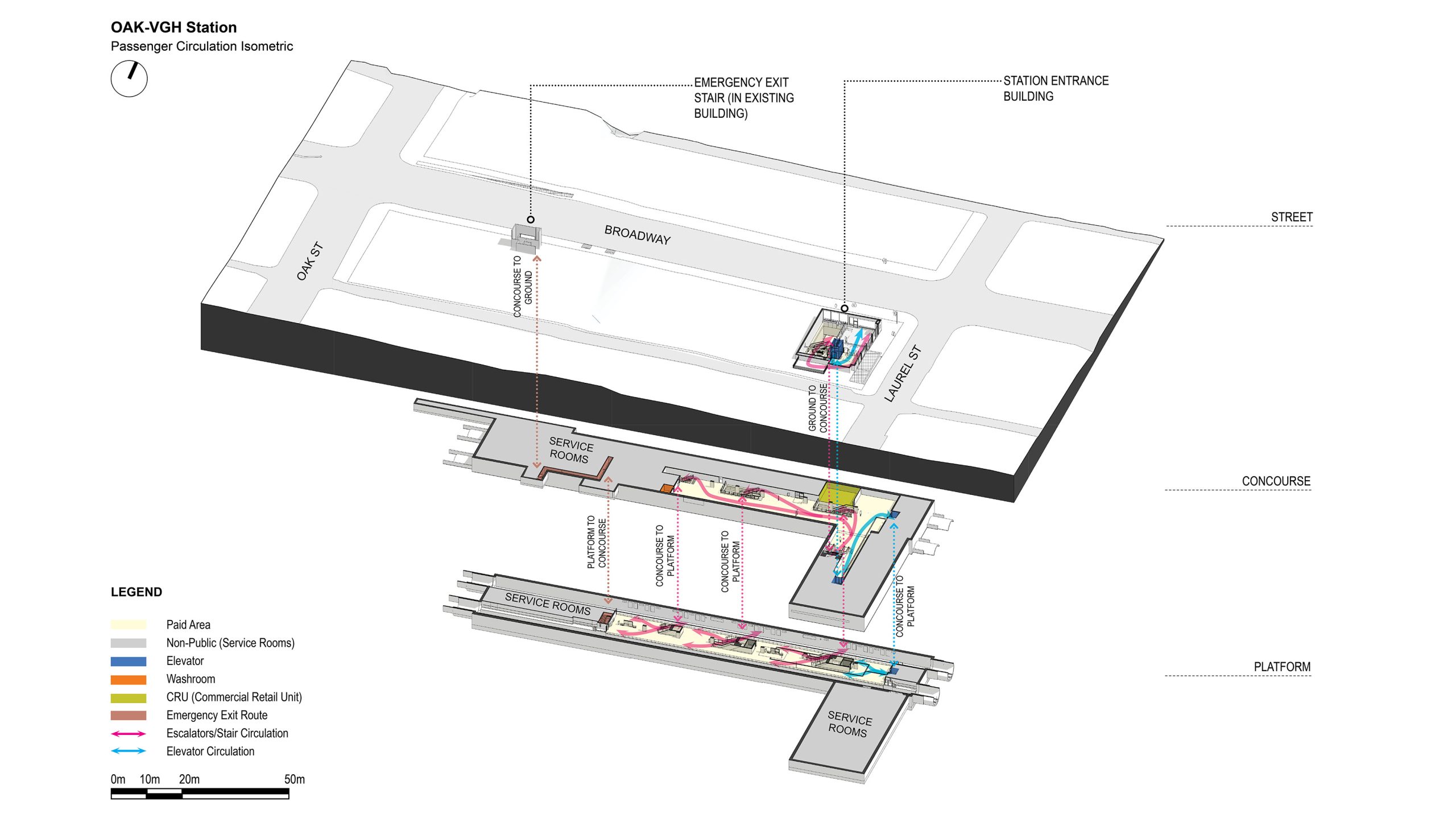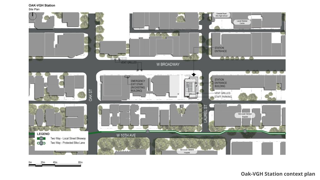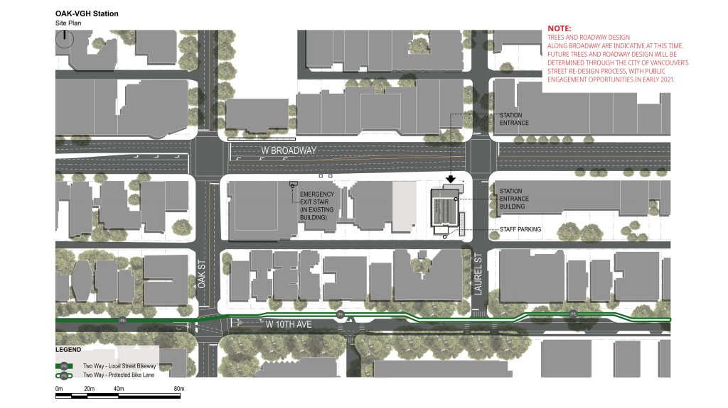 Between November 2020 and May 2021, two virtual open houses were held to present draft designs for the above-ground portions of the future stations, including entrances, adjacent plazas, emergency exits and ventilation locations, landscaping, and station art. Feedback received was provided as input to the City of Vancouver’s design advisory process and considered in finalizing the stations’ designs. Renderings shared as part of this process can be seen below. More information available here.